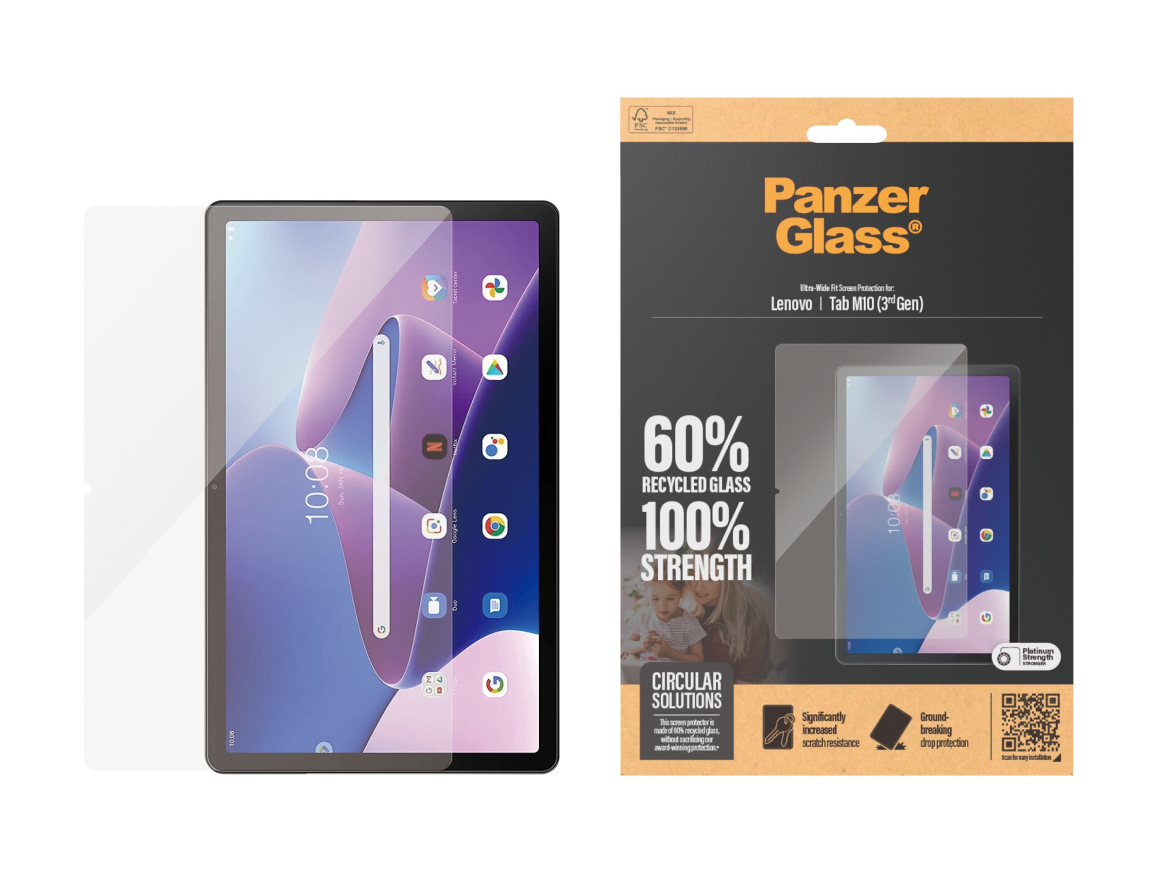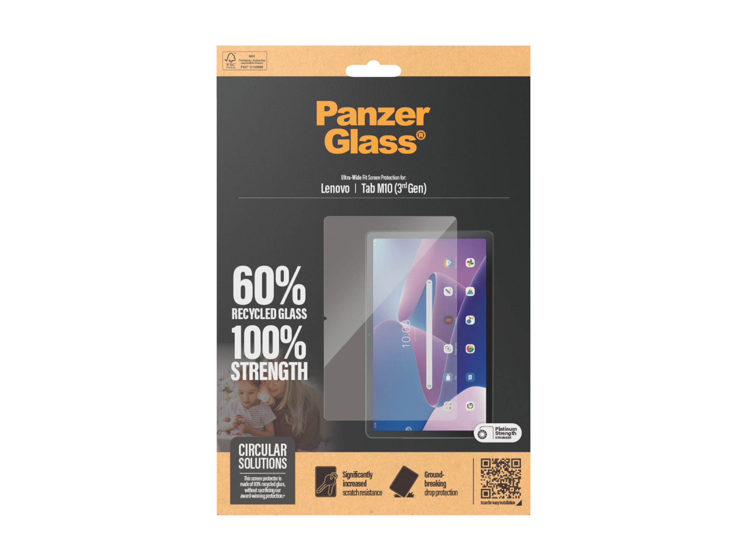 Vi præsenterer vores PanzerGlass skærmbeskytter, lavet af 60% glas. Børn elsker deres tablets. Men de skrammer, ridser, taber og smadrer også deres tablets. Sådan er det bare, og det er der ikke noget at gøre ved … eller jo, det er der faktisk: Med en skærmbeskytter fra PanzerGlass kan du holde hverdagens ups'er, hovsa'er og åh-neeeeej'er på sikker afstand af din skærm. Det hærdede glas fungerer som en diskret airbag, der beskytter din tablet mod alt fra skarpe bordkanter og stenhårde fortove til ivrige børnehænder, der slår ned i skærmen. Glasset har endda en smudsafvisende belægning med antibakteriel effekt, der reducerer fedtfingre og dræber op til 99,99 % af alle almindelige overfladebakterier.Installationen er legende let, og når skærmbeskytteren én gang er sat på, er det slut med at frygte synet af din tablet med kurs mod jorden. Det kommer muligvis aldrig til at ske, men hvis det gør, vil du fortryde, at du ikke klikkede "Tilføj til kurv".Skærmbeskytteren har størrelsen "Ultra-Wide Fit", som giver maksimal beskyttelse og en fuldendt skærmoplevelse, samtidig med at den efterlader plads til en case. Perfekt til dig, der vil beskytte hele fronten af din tablet. Og emballagen, ja, den er naturligvis FSC -mærket og kan genanvendes.