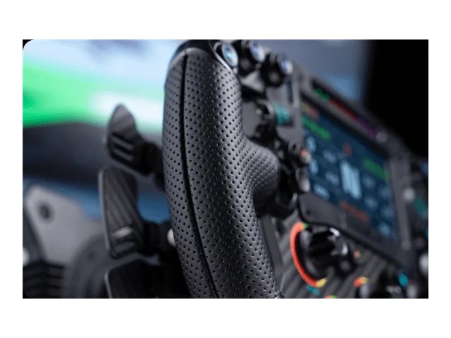 Rattet har perforerede lædergreb, der sikrer komfort under lange racersessioner og et fast greb for præcis håndtering.