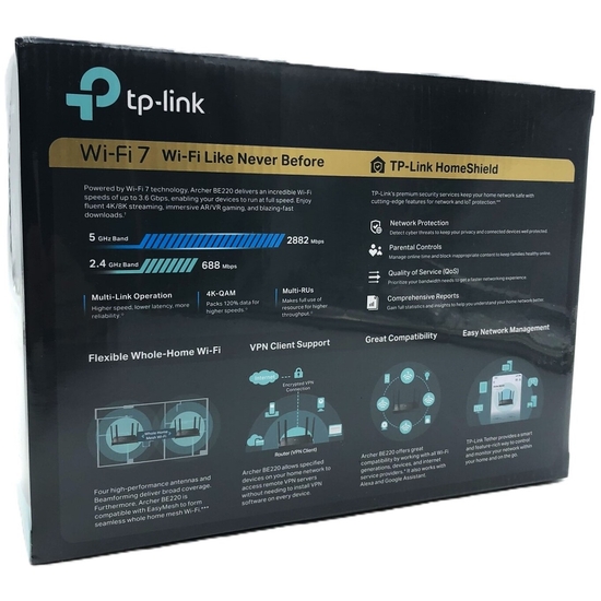 | Produktbeskrivelse | TP-Link Archer BE220 V1 - trådløs router - Wi-Fi 7 - desktop |