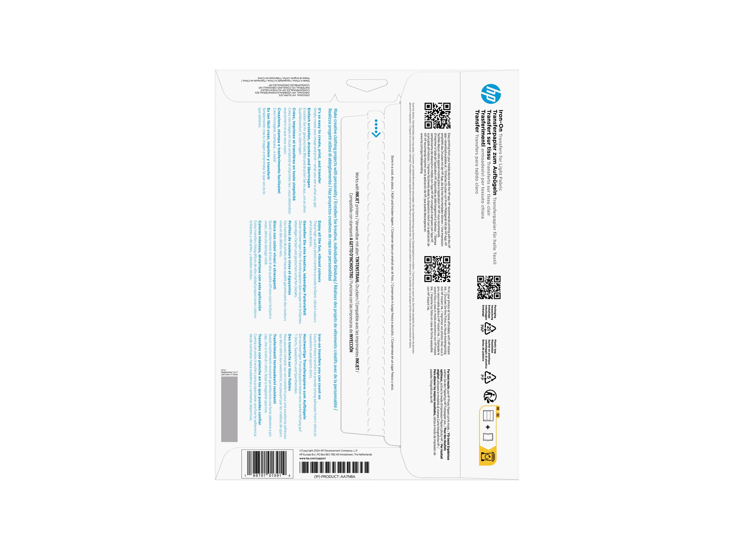 Kan nemt overføres på forskellige lyse stoffer fra bomuld til polyester og bomulds-/polyesterblandinger. Disse overføringsfotos i høj kvalitet kan bruges sammen med inkjetprintere og er optimeret til HP-blækprintere, så du får levende farver og skarpe detaljer.