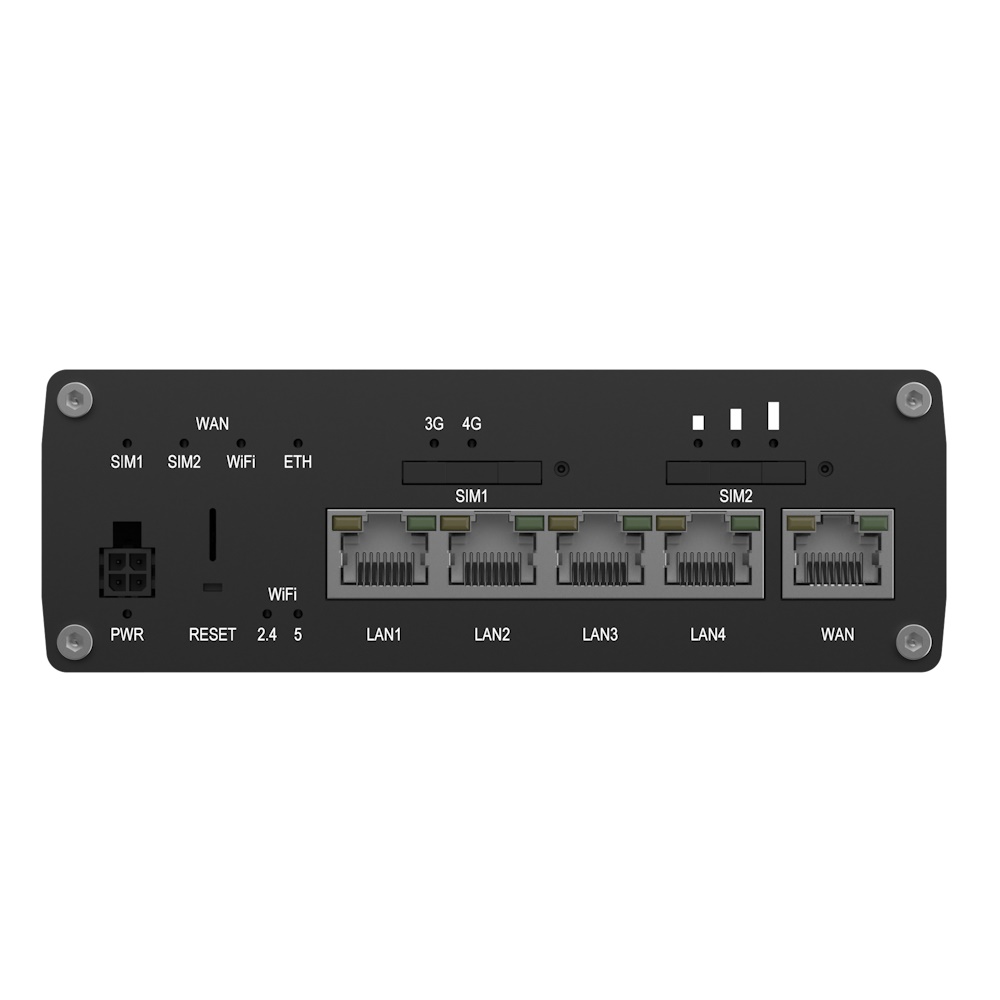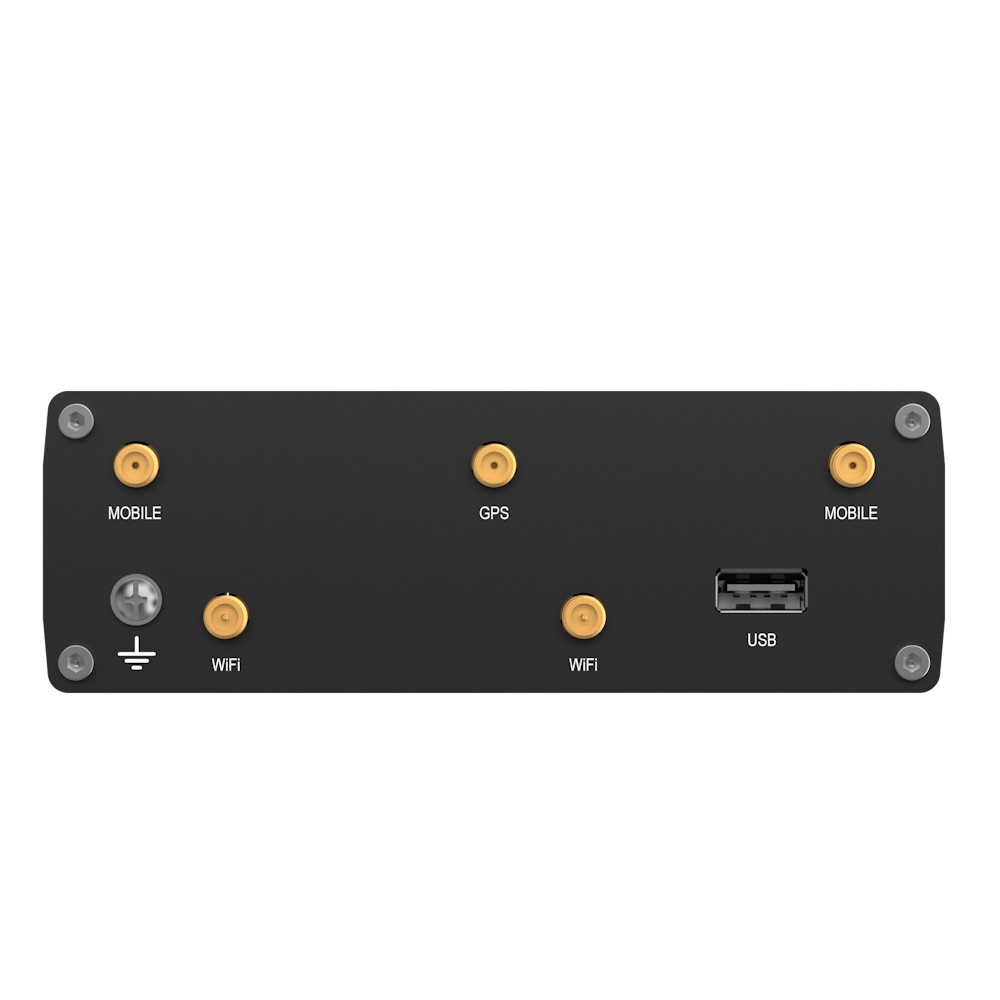 | Ports | 5 x RJ45 ports, 10/100/1000 Mbps, 1 x Digital Input, 1 x Digital Output on 4-pin power connector, 2 x SIM slots (Mini SIM – 2FF), 1.8 V/3 V, 1 x 4-pin power connector, 4 x SMA for Mobile, 2 x RP-SMA for Wi-Fi, 1 x SMA for GNNS, 1 x USB A port for external devices |