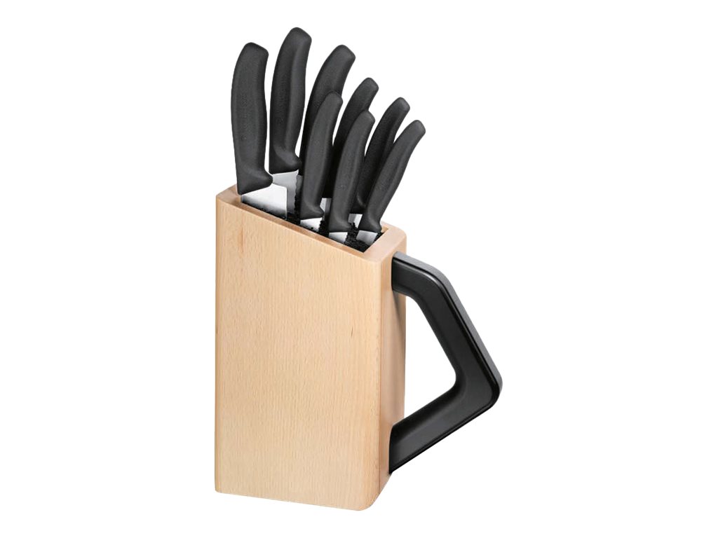 Pakkeindhold Santoku-kniv (17 cm), knivblok, skrællekniv (10 cm), skrællekniv (8 cm), brødkniv (21 cm), tomatkniv (11 cm), skærekniv (19 cm), skrællekniv (savtakket, 8 cm), steakkniv (11 cm)