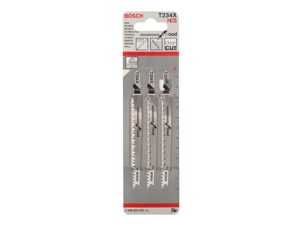 | Produktbeskrivelse | Bosch Progressor for Wood T 234 X - stiksavsklinge - for træ, spånplade, træfiberplade, blødtræ, ikke-slibende træmaterialer - 3 stykker |
