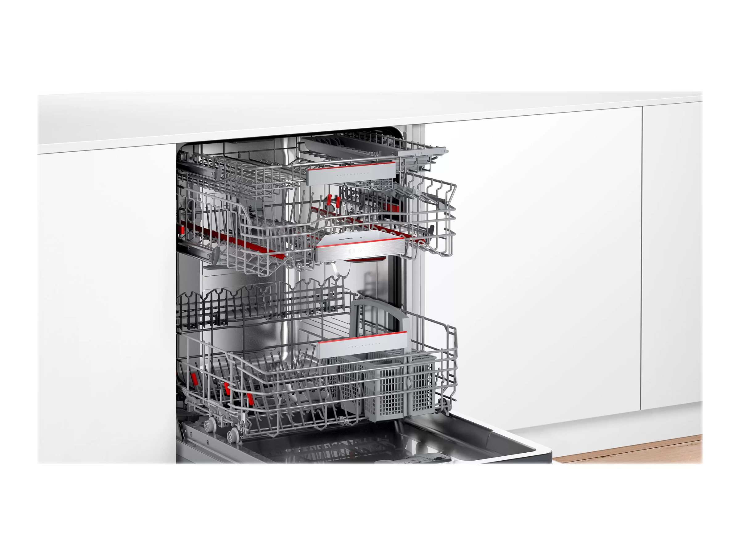 | Övre korg | Justerbar höjd Rackmatic, 2 kopphållare, utility shelf, 2 vikbara plåthållare, Extra Clean Zone |