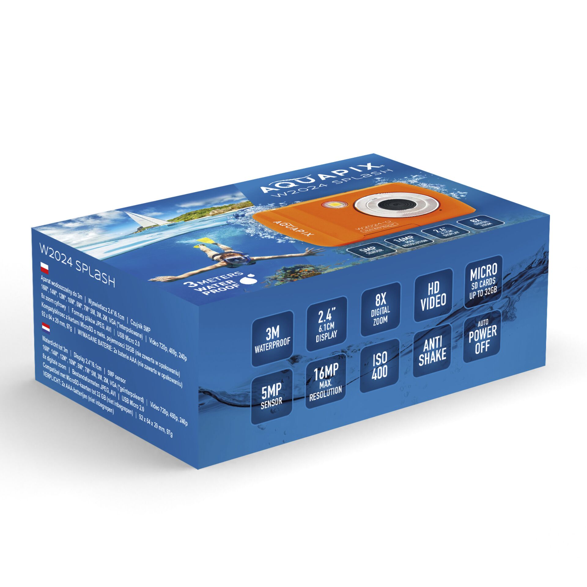 Lad vandet være dit element! Alle, der kan lide at slappe af i swimmingpoolen eller lede efter skatte i havet, har brug for et kamera, som kan fange og gemme de største øjeblikke i, på og under vandet! Det fungerer bedst med Aquapix W2024 Splash. Dette digitale undervandskamera er vandtæt ned til tre meter, bliver ikke væk takket være den fastgjorte håndrem og tager skarpe billeder selv i oprørt vand på grund af antirystefunktionen. W2024 Splash er beskyttet på ydersiden og fyldt med fantastisk teknologi på indersiden. Med 8x digital zoom og en opløsning på op til 16 megapixel vil dine billeder altid være fantastiske. Tag billeder af den farverige undervandsverden, og glem ikke den nedgående sol og dine surfvenner.