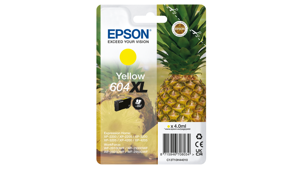 Epsons pålidelige, separate blækpatroner med fire farver er ideelle til daglig udskrivning. Der er en patron til en fornuftig pris, som passer til alle brugertyper med både standard- og XL-størrelser separat eller i multipakker. Find det nemt i butikken ved at søge efter Ananas-billedet.