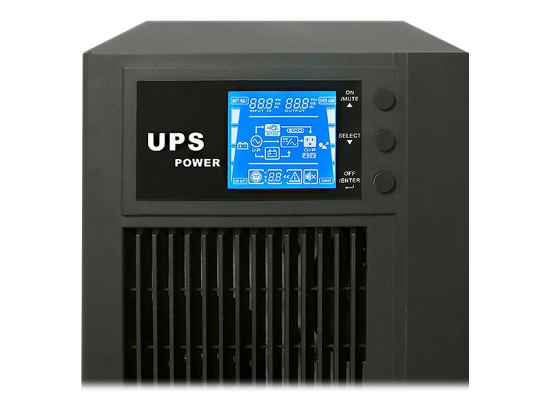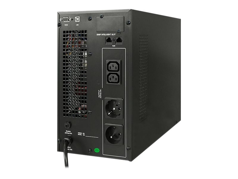 | Egenskaper | Hörbart larm, LCD-bildskärm, spänningsövervakning, intern förbikoppling, överbelastningsskydd, underspänningsskydd, kortslutningsskydd, Eco-Mode, lågspänningsskydd, dubbel konvertering, laddning avstängt läge, Fast Charge-teknik, load monitoring |