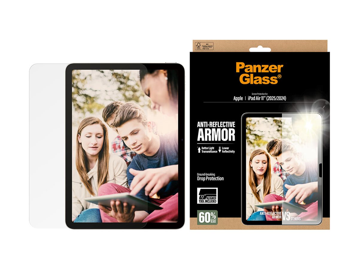 Skærmen på din iPad skal både være godt beskyttet og nem at se. Med skærmbeskyttelsen Anti-Reflective Armor fra PanzerGlass får du begge dele. Den er lavet af 60 % genanvendt glas og beskytter din telefon mod hverdagens uheld. Den nye anti-reflekterende behandling minimerer genskin markant og maksimerer samtidig lysgennemtrængningen. Det betyder, at du kan se din skærm i strålende solskin, stort set uden genskin. Teksturen giver et blødt look, mindre genskin og meget lav friktion. For slet ikke at nævne over 94 % lysgennemtrængning og under 0,3 % genskin. Den er legende let at montere med det nye FastFit tool . Glem alt om skæv montering og støvkorn under glasset. Bare læg din iPad med forsiden opad, træk i tappen, og vupti – perfekt montering. Hvis du ønsker endnu mere beskyttelse, kan skærmbeskyttelsen Anti-Reflective Armor kombineres med PanzerGlass PicturePerfect eller Hoops kameralinsebeskyttelse og et CARE by PanzerGlass cover.