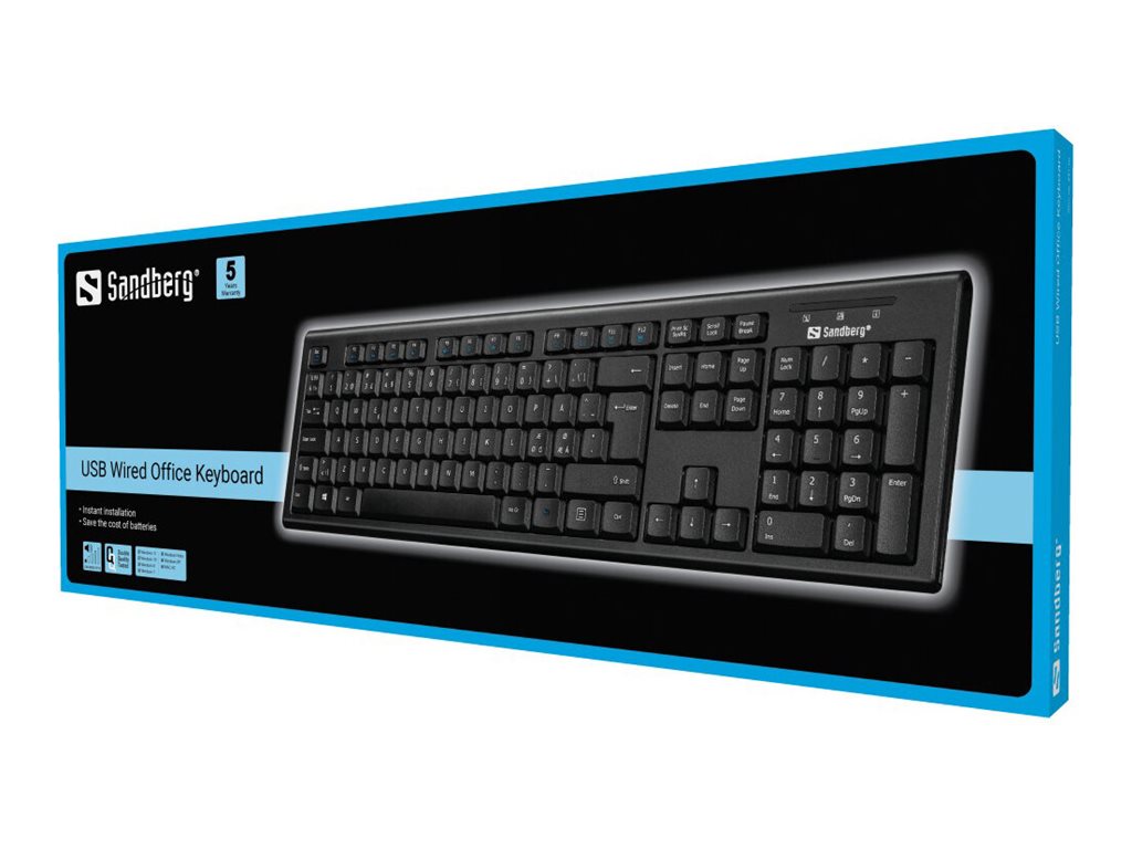 Sandberg USB Wired Office Keyboard er et rigtigt godt standardtastatur, der bare virker. Sæt blot tastaturet i en USB port i din computer, og det er klar til brug med det samme. Tastaturet får strøm fra computeren, så du skal aldrig bekymre dig om batteriskift, og sparer samtidig udgiften hertil.