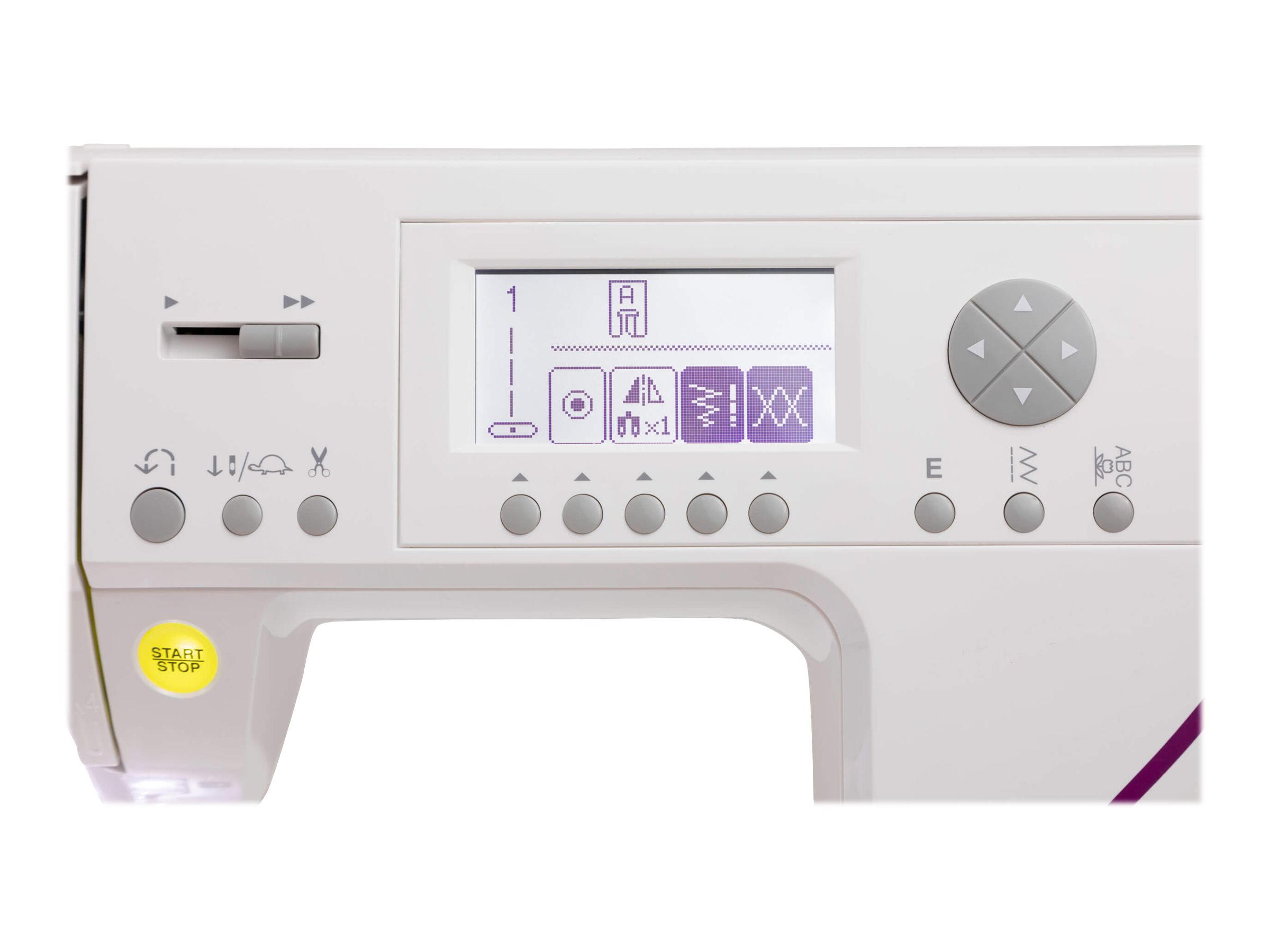 | Funktioner | Hastighetskontroll, automatisk fästning, elektronisk dubbelnålskontroll, automatisk spänning, spegelbildsfunktion, stygnlängdsväljare, pressarfotsensor, programmable needle up/down, trådskärare, stitch memory function, stygnbreddsväljare, built-in 5 |