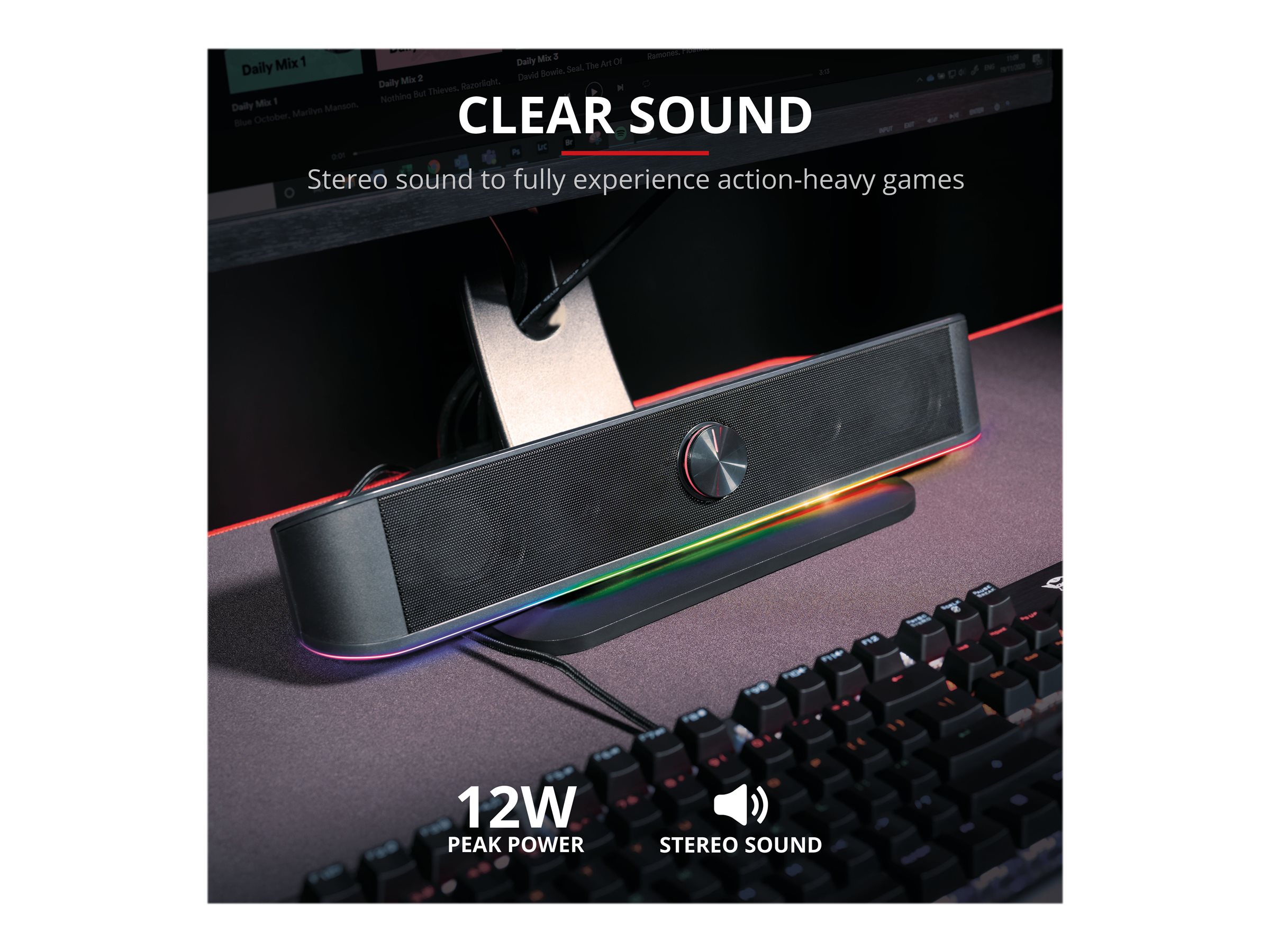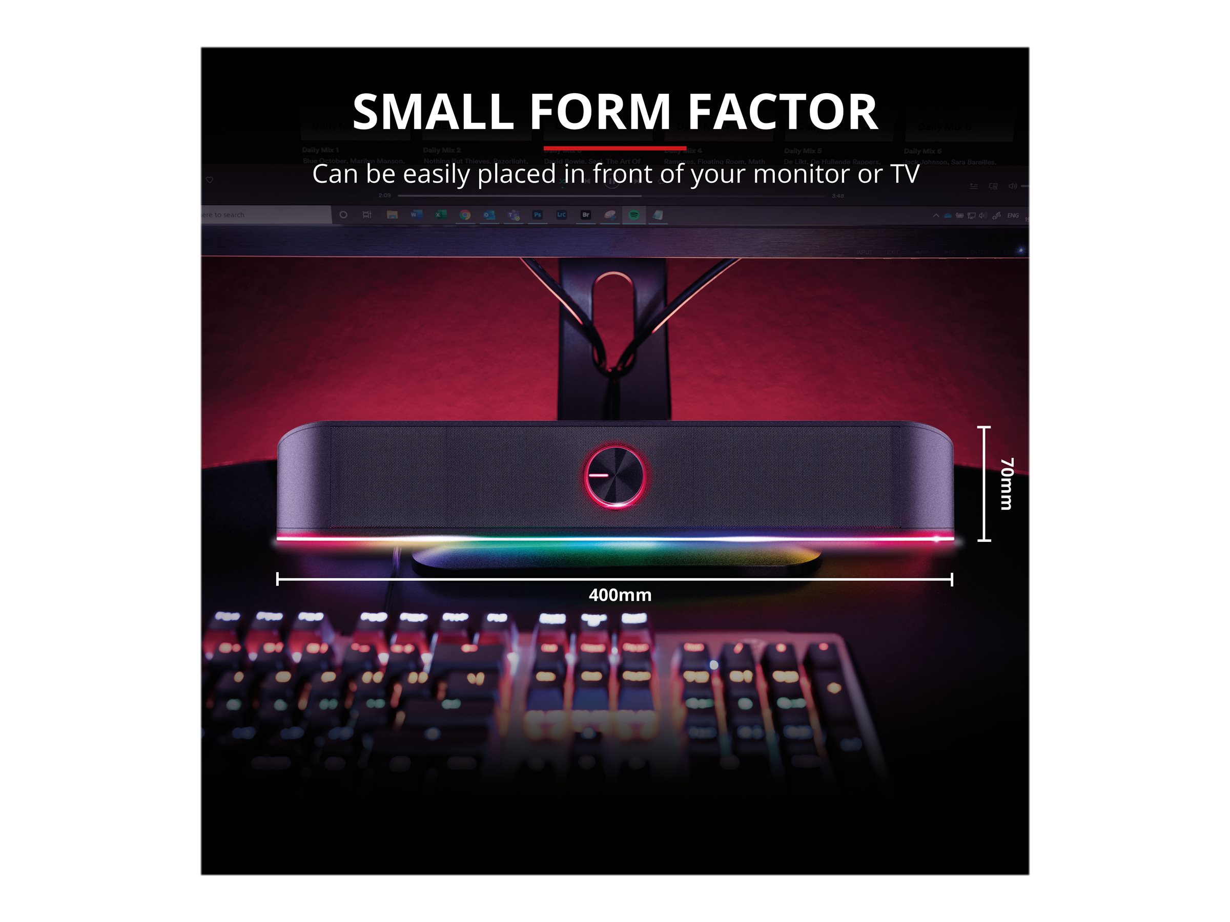 Stereo-soundbar med RGB-belysning og pladsbesparende design.