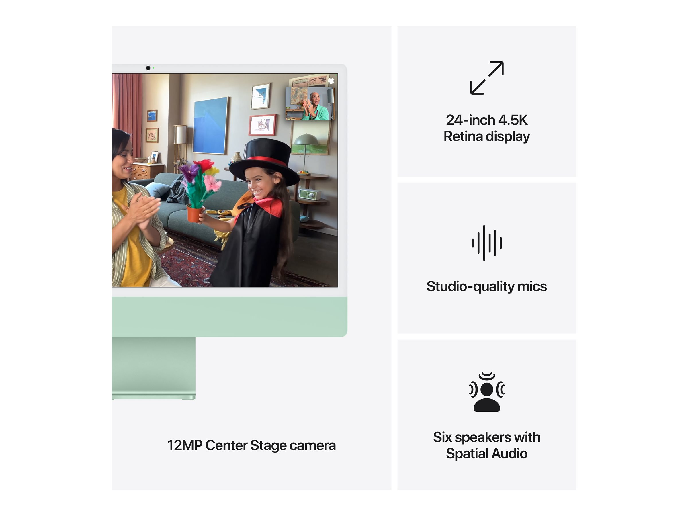 Få et perfekt billede og en fantastisk lyd med et 12MP Center Stage-kamera, tre mikrofoner i studiekvalitet og seks højttalere med Spatial Audio.