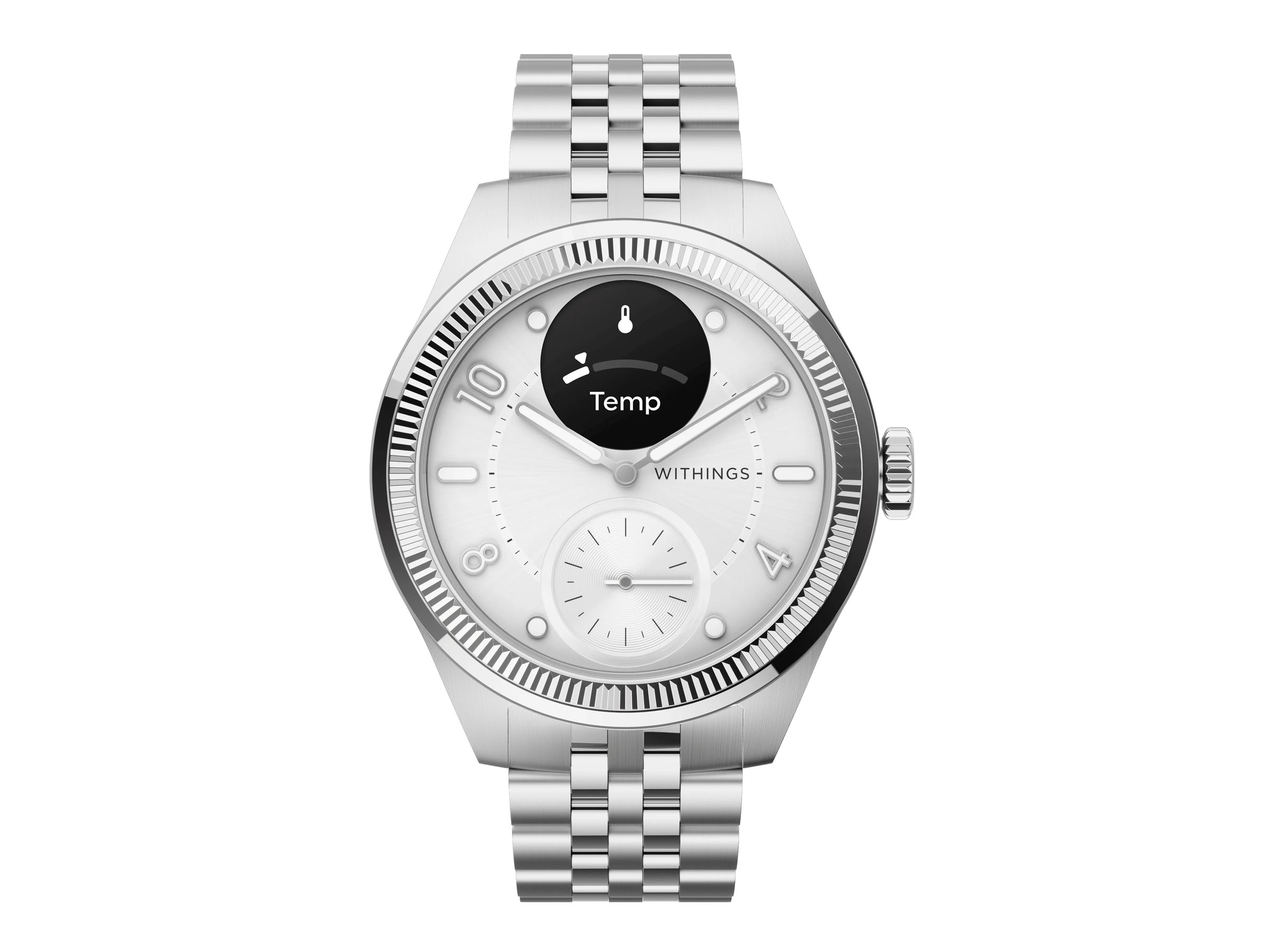 ScanWatch Nova har en rund urkasse i rustfrit stål kombineret med en keramisk/rustfri stålramme og et safirglas, der giver holdbarhed og tidløs elegance. Oyster Metal-armbåndet med foldelås tilføjer raffinement og gør det velegnet til enhver lejlighed.