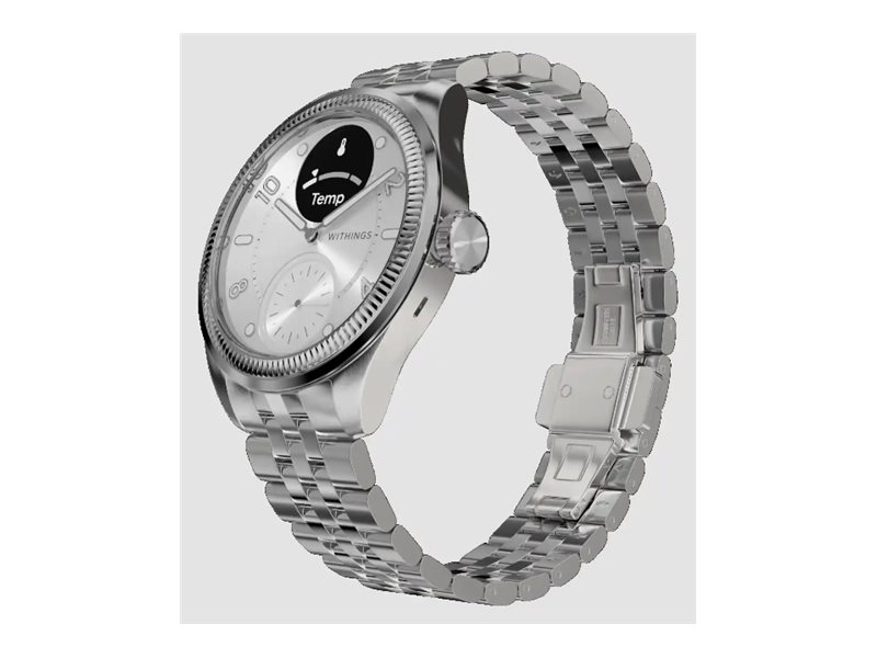 Withings ScanWatch Nova blander sofistikeret design med sundheds- og fitnessovervågning. Dette hybride smartwatch har en holdbar kasse i rustfrit stål og en keramisk/rustfri stålramme, der er beskyttet af safirglas, hvilket sikrer lang levetid og stil. Oyster Metal-armbåndet med foldelås giver en sikker og justerbar pasform for komfort hele dagen.