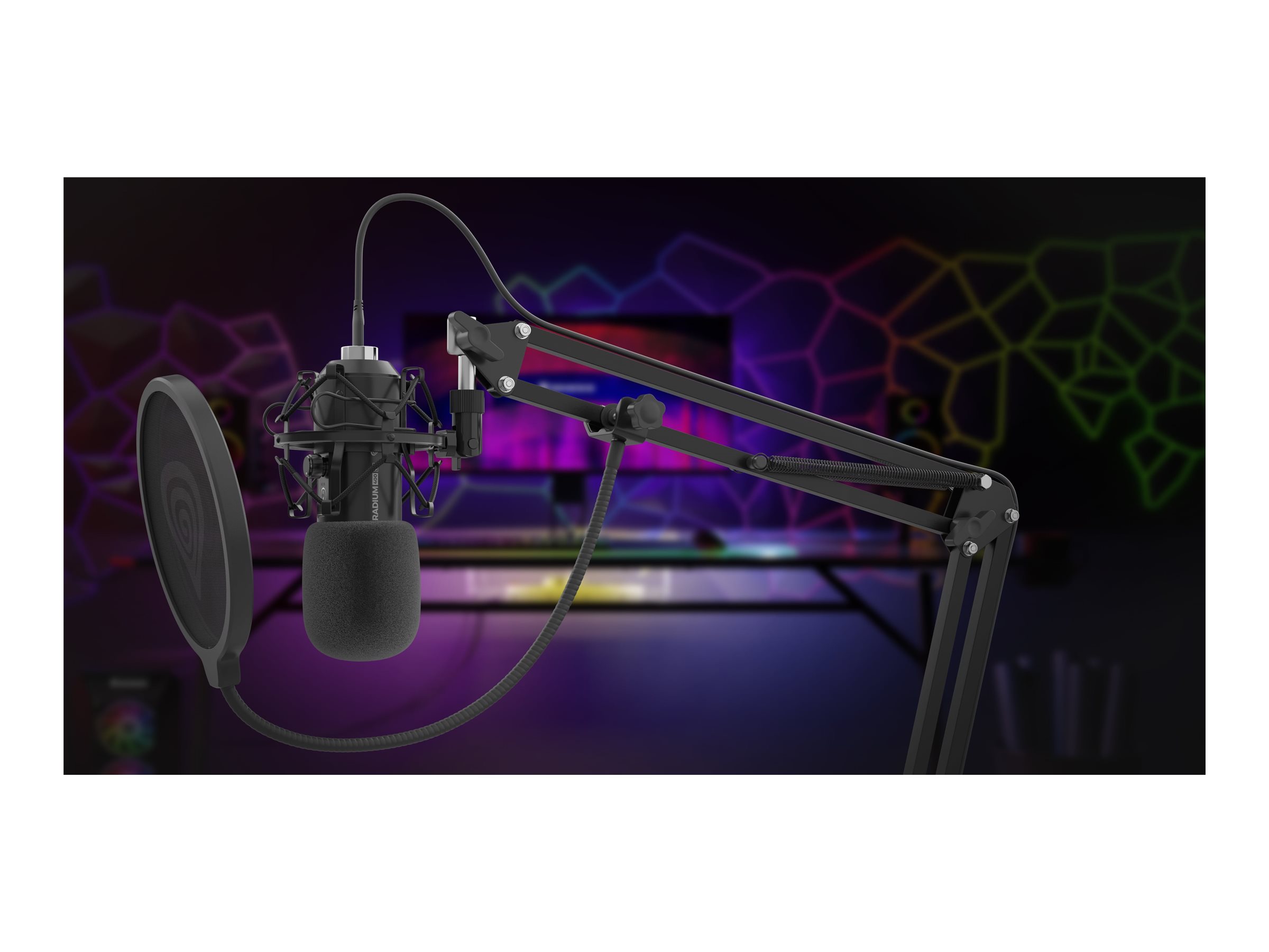 | Udstyr inkluderet | Stødabsorberende beslag, arm, mikrofonsvamp, popfilter, mikrofonkabel |