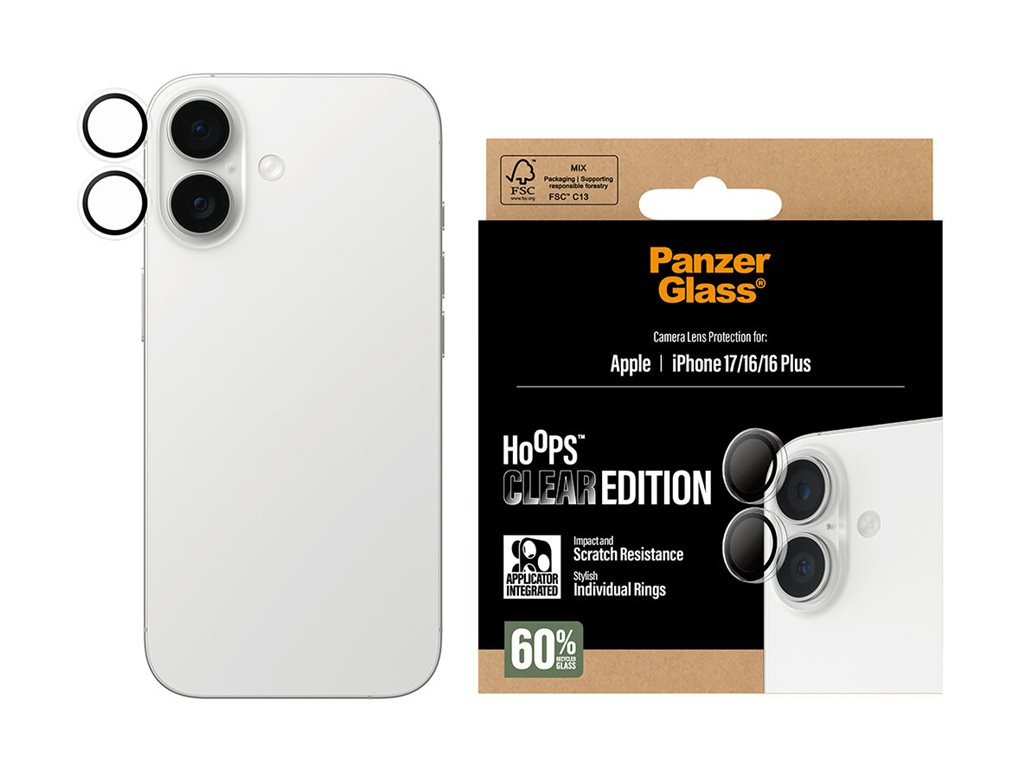 Ingen "ups!" med Hoops! Hoops fra PanzerGlass beskytter dine kameralinser mod skarpe bordkanter, stenhårde fortove og andre små uheld, der kan ødelægge linserne – og dine fremtidige billeder. De tynde optiske ringe er udstyret med hærdet glas og en ramme i metal, der ikke blot holder ridser og revner på sikker afstand, men også ser elegante ud på telefonen. Og hvis du er bekymret for billedkvaliteten, kan du tage det helt roligt: Hoops påvirker hverken skarpheden, dybden eller farverne på dine billeder – de giver dig bare lidt mere ro i maven. Installationen er også legende let. De optiske ringe er udstyret med en selvklæbende silikonekant og leveres med et lille, enkelt installationsværktøj, der gør det så nemt at sætte ringene på linserne, at de fleste kan gøre det i første forsøg! Og husk: Når først Hoops er installeret, behøver du ikke længere frygte synet af dine kameralinser med kurs mod asfalten. Det kommer muligvis aldrig til at ske, men hvis det gør, vil du fortryde, at du ikke klikkede "Tilføj til kurv". Hoops kan forlænge levetiden på din telefon, så du måske en dag kan give den videre til en anden, som vil elske den lige så højt som dig. Det er ren telefonkærlighed. For jo længere vi kan holde vores enheder i live, jo længere kan vi vente med at producere nye enheder, som belaster miljøet. Og nu vi taler om miljøet, så leveres Hoops i en genanvendelig FSC -mærket æske.