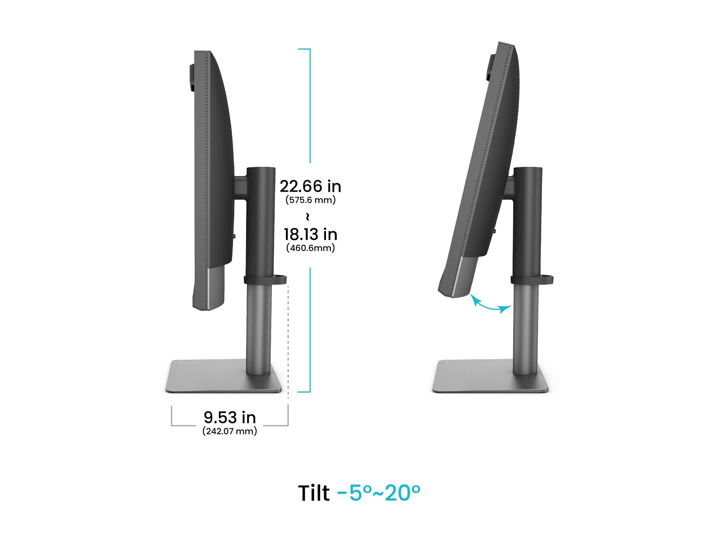 | Dimensioner (B x D x H) - med stander (liggende retning, højeste position) | 61.4 cm x 24.207 cm x 57.56 cm |