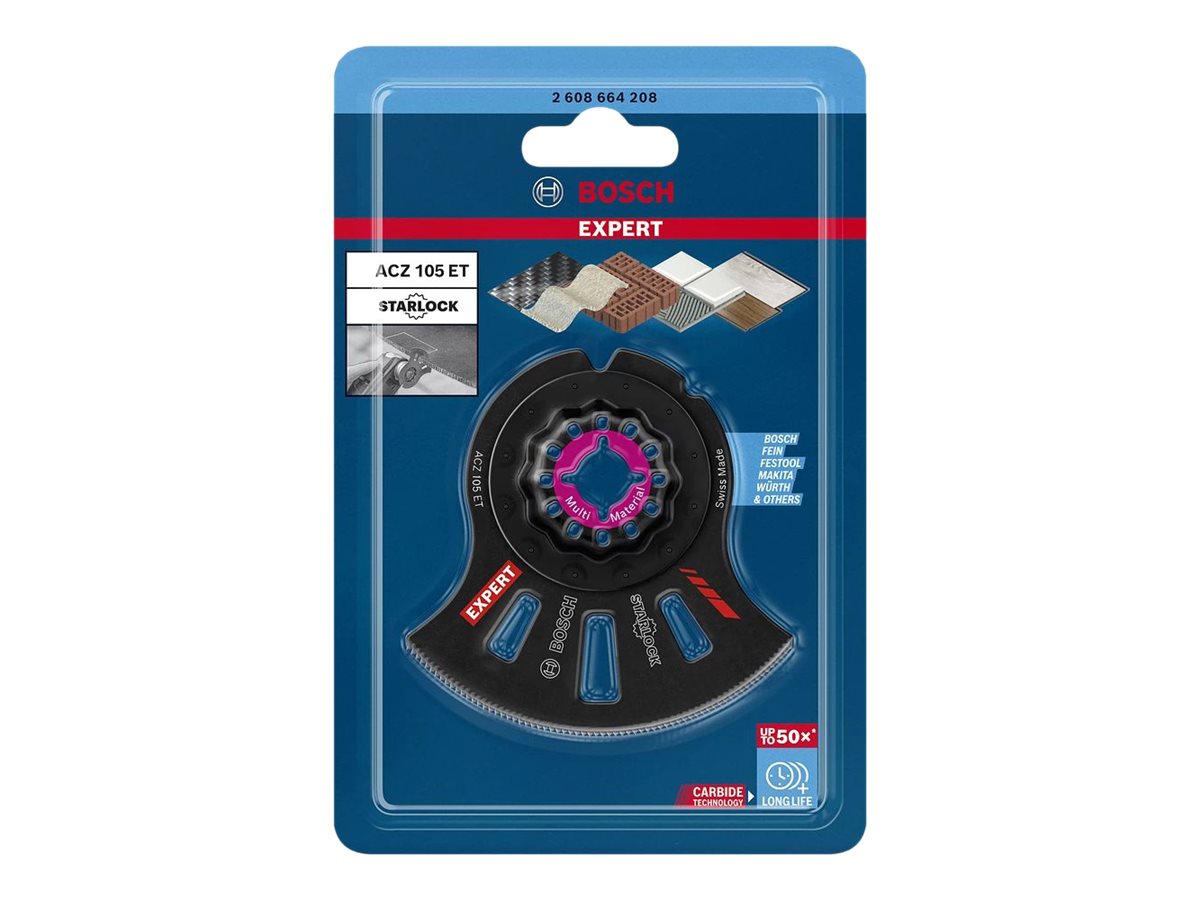 | Produktbeskrivelse | Bosch Expert ACZ 105 ET - segmentsavklinge - for plastik, mursten, polyvinylklorid (PVC), morter, solide overflader, glasfiberforstærket plastik, karbonfiberforstærket plastik, slibende laminater, slibende kompositmaterialer |