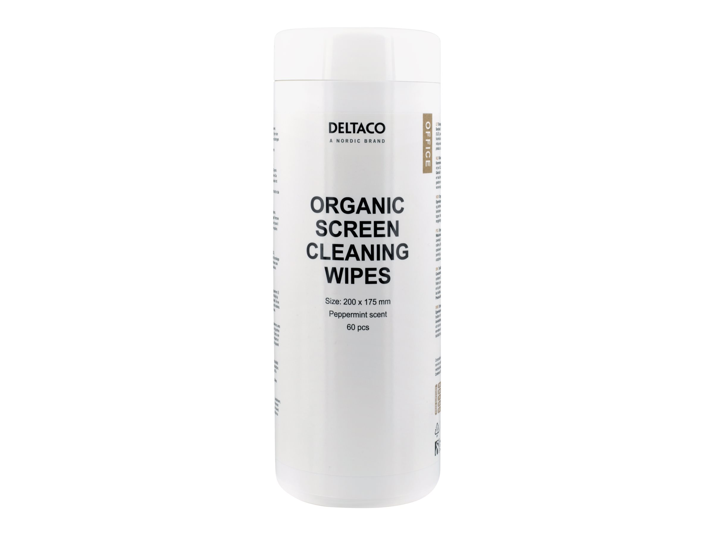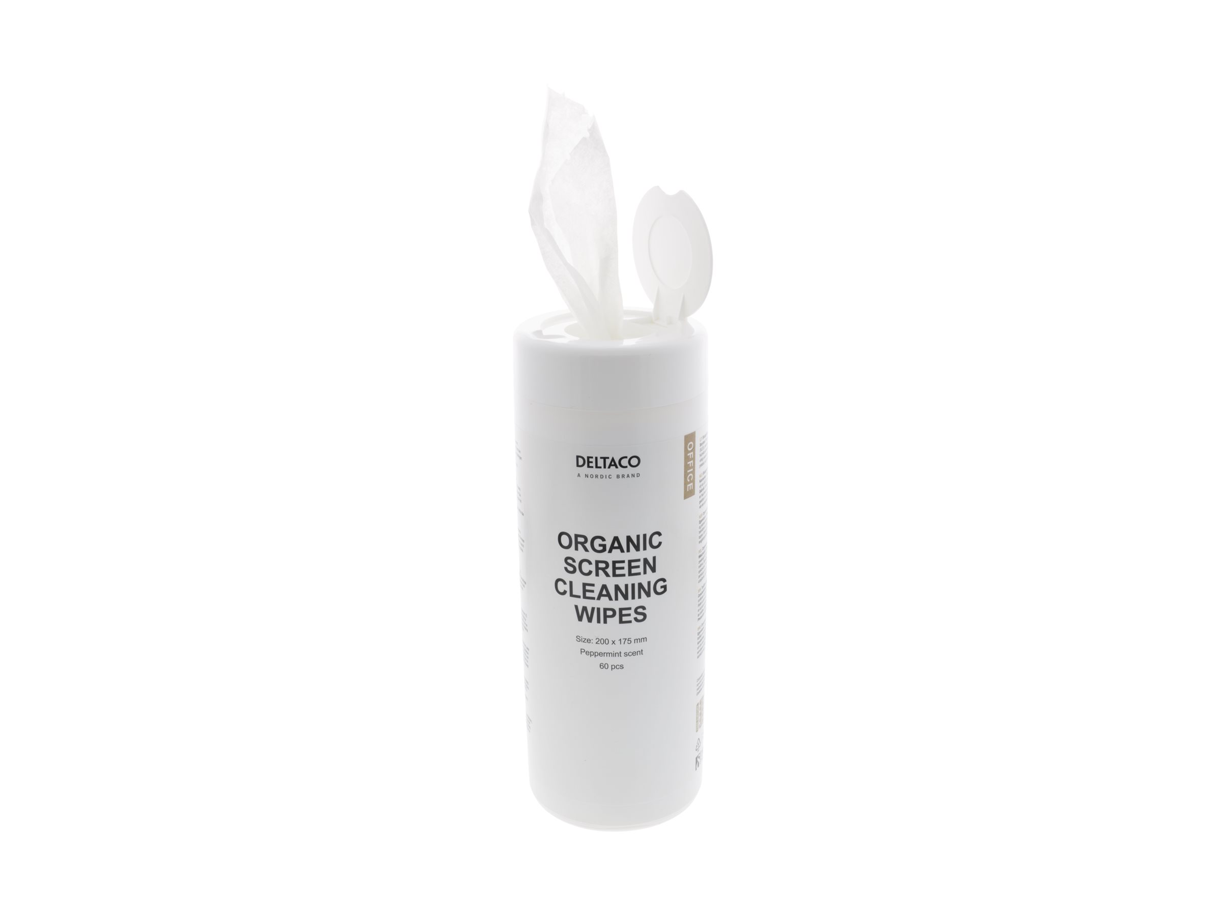 Biologisk nedbrydelige rengøringsservietter med en pebermynteduft, der kan bruges på forskellige skærme, der findes på et kontor. De er forskellige fra mange r rengøringsservietter, fordi de ikke indeholder natrium lauret sulfat, parabener, fosfater eller oliederivater.