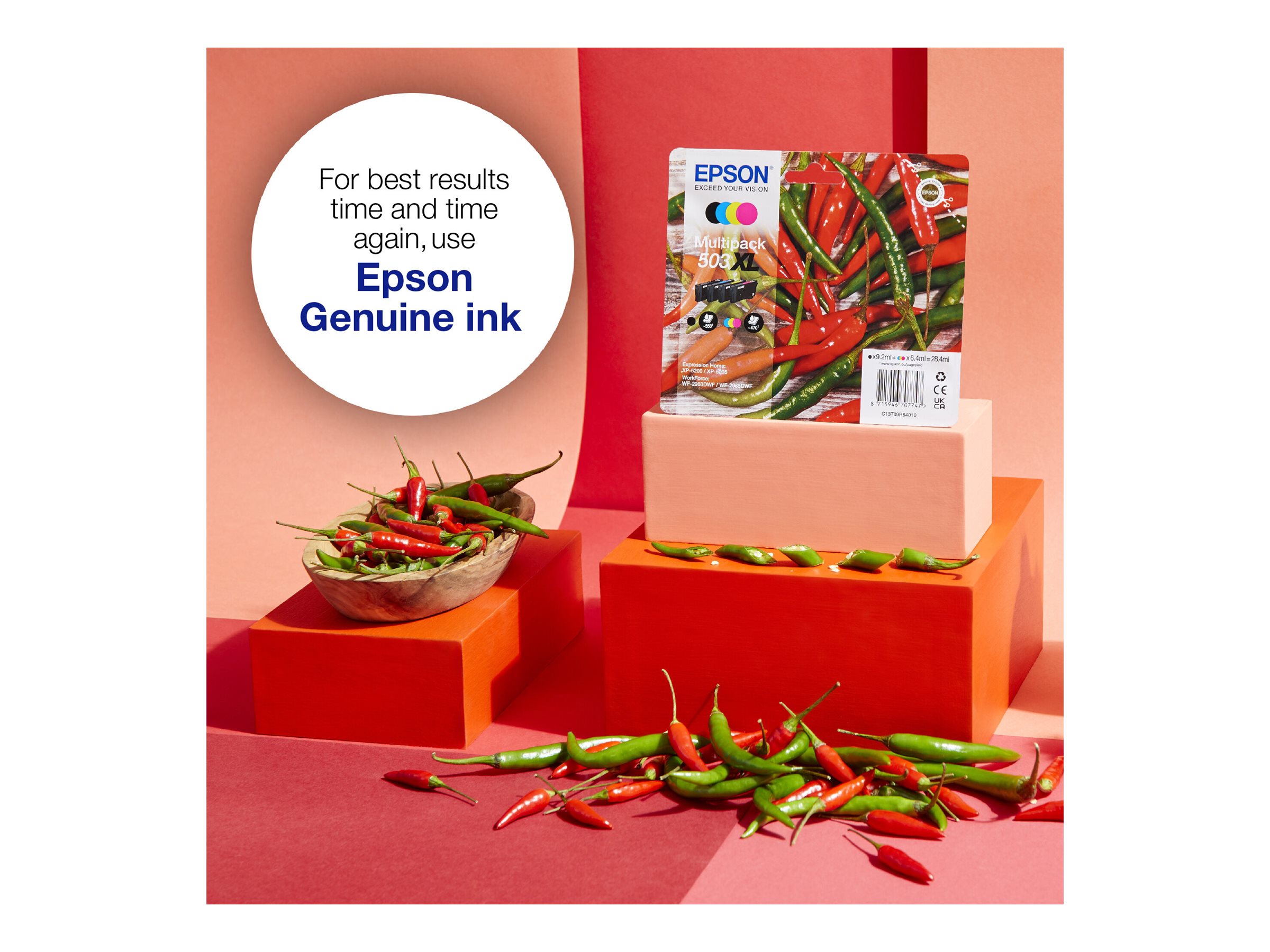 Epsons pålidelige, separate blækpatroner med fire farver er ideelle til daglig udskrivning. Der er en patron til en fornuftig pris, som passer til alle brugertyper med både standard- og XL-størrelser separat eller i multipakker. Find det nemt i butikken ved at søge efter Chili-billedet.