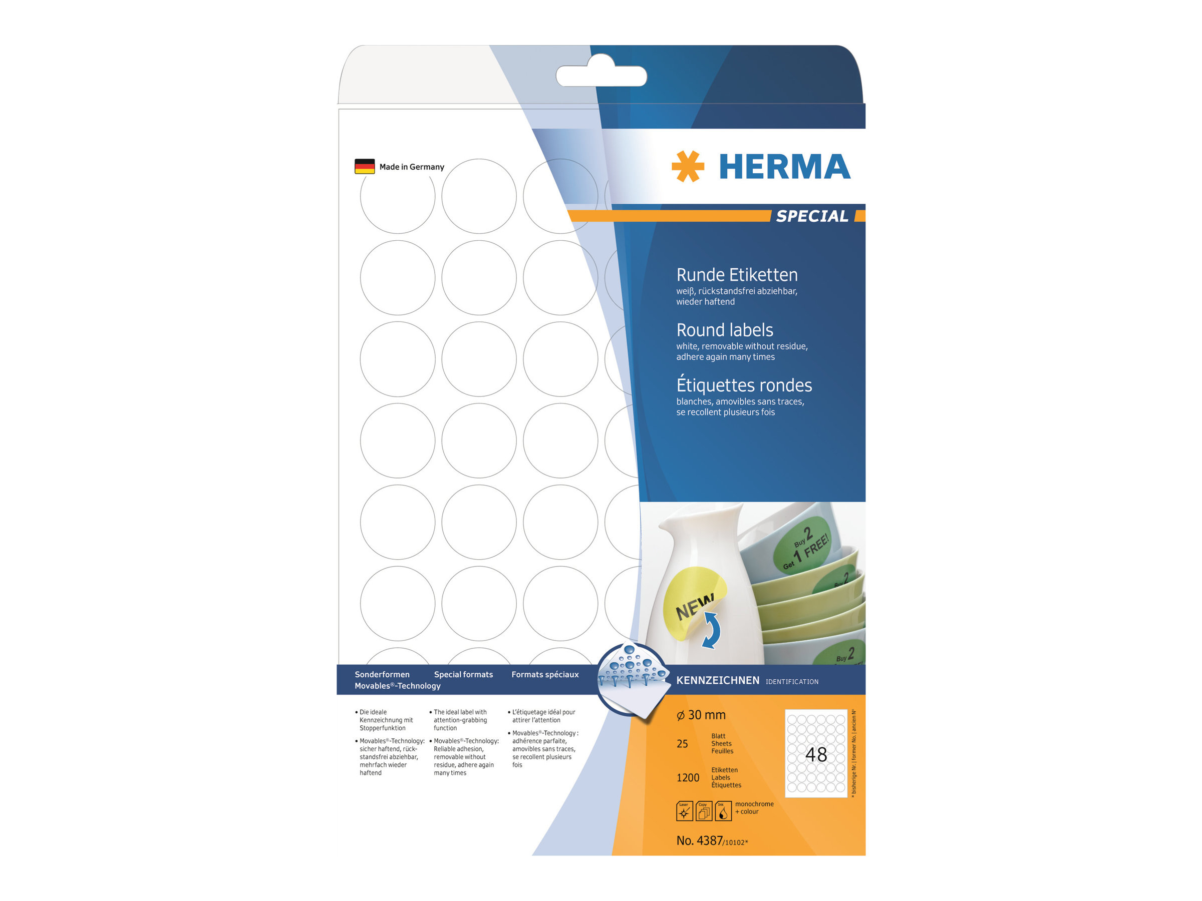 Selvklæbende etiketter, runde, ovale og kvadratiske, på A4-ark. Med Movables -Technology: Hæfter sikkert på alle glatte, tørre, ubeskadigede og støvfrie flader, kan trækkes af uden at efterlade rester og uden at beskadige underlaget, kan sættes på igen uden problemer og hæfter flere gange. Ideelle til kortvarige eller skiftende mærkninger og overflader, der ikke må beskadiges. Særdeles gode udskrivningsresultater på alle laser- og inkjet-printere, kopimaskiner, farvelaserprintere og farvekopimaskiner. Problemfri redigering i kraft af sikkerhedskant hele vejen rundt og optimal fladhed. Miljøvenlig: bleget uden anvendelse af klor, FSC Mix Credit, lim uden opløsningsmidler. Etiketterne kan genbruges 100 % med affaldspapir, emballage og æske. Gratis software-løsninger: www.herma.com/software.