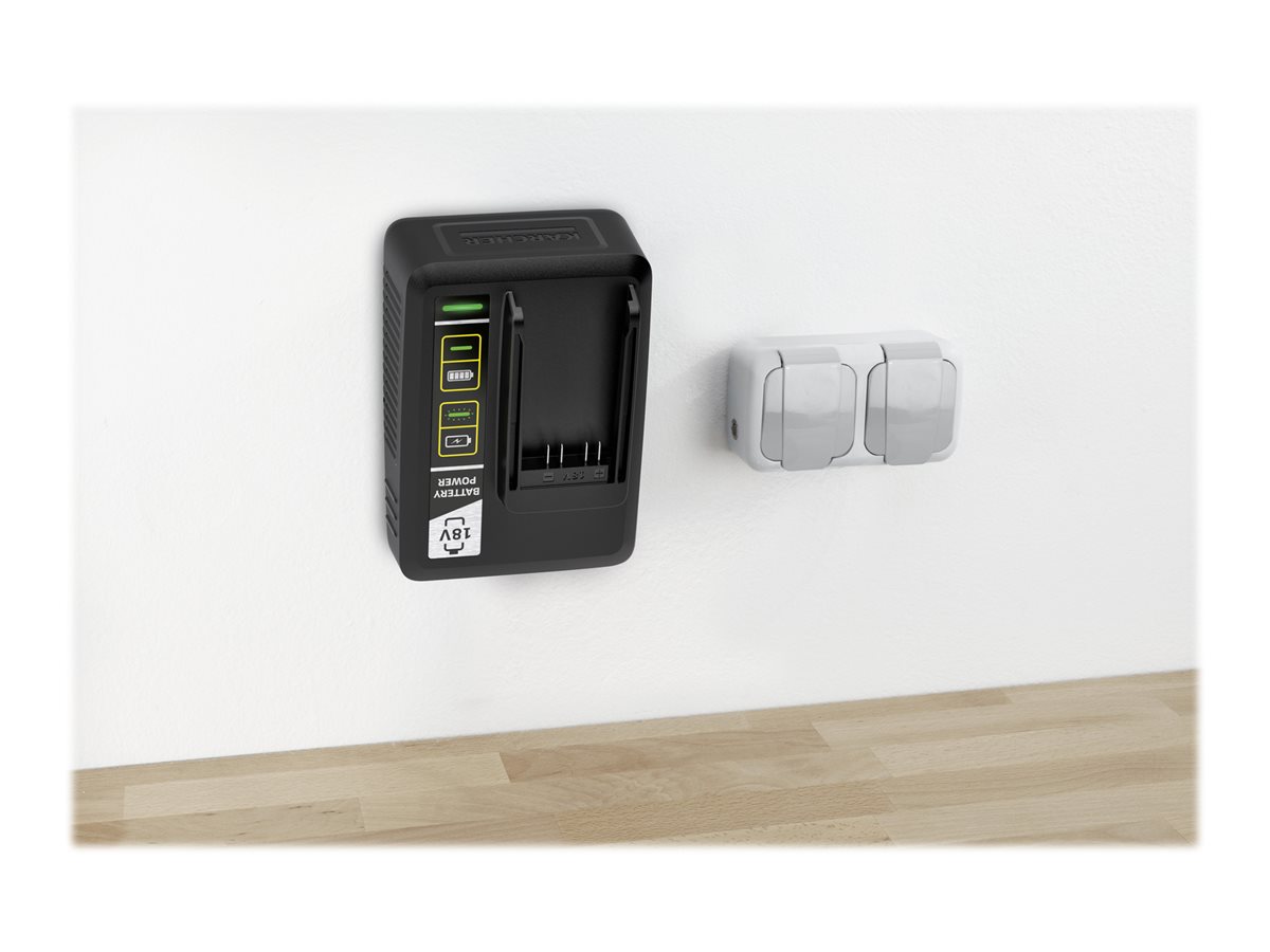 Takket være den integrerede vægmontering, kan hurtig opladeren hurtig påsættes væggen. Hurtig opladeren oplader 18 V / 2.5 Ah Kärcher Battery Power batteriet til 80% på 44 minutter, og kan bruges til alle batterier i Kärchers 18 V Batteri Power batteriplatform.