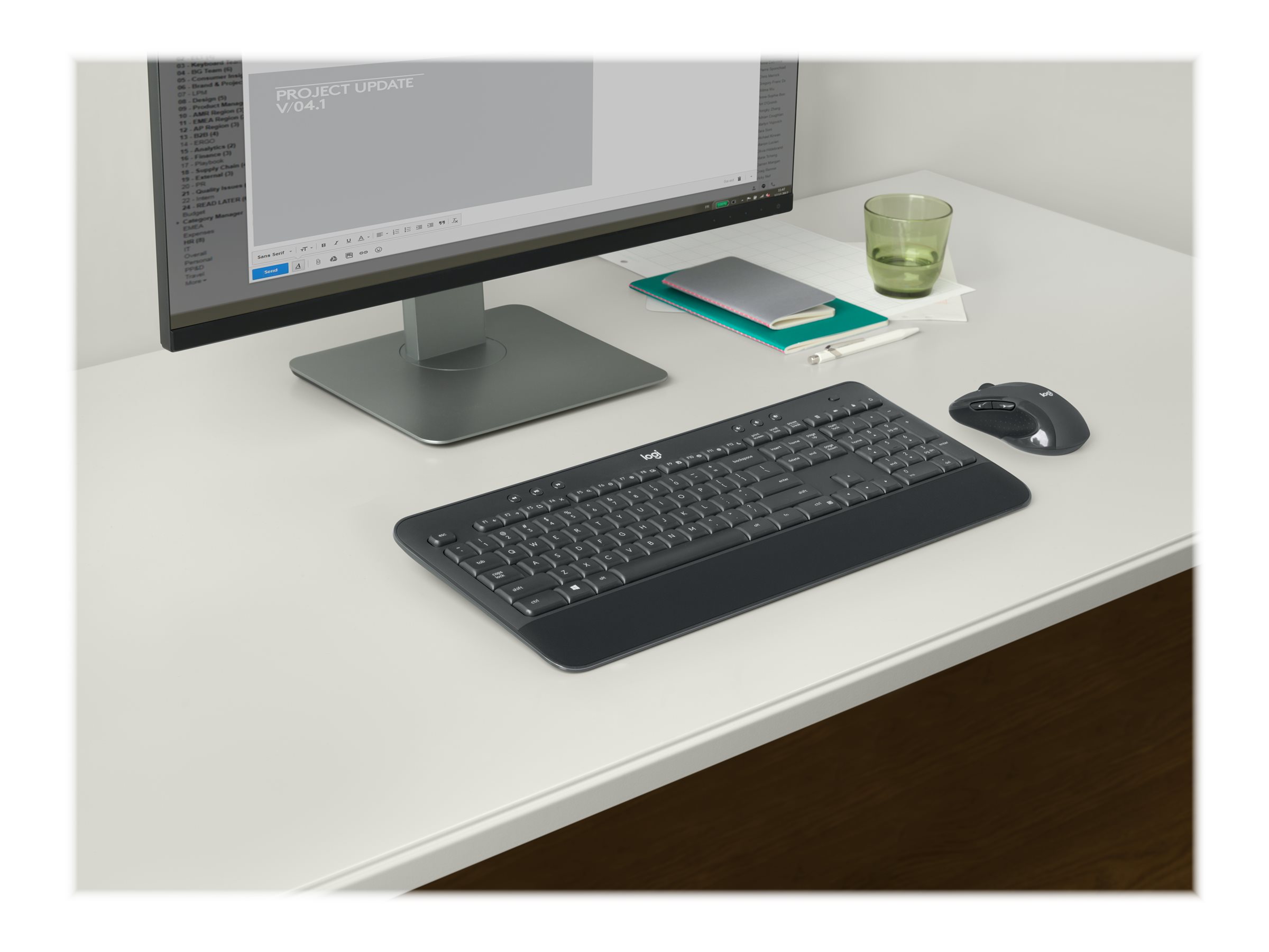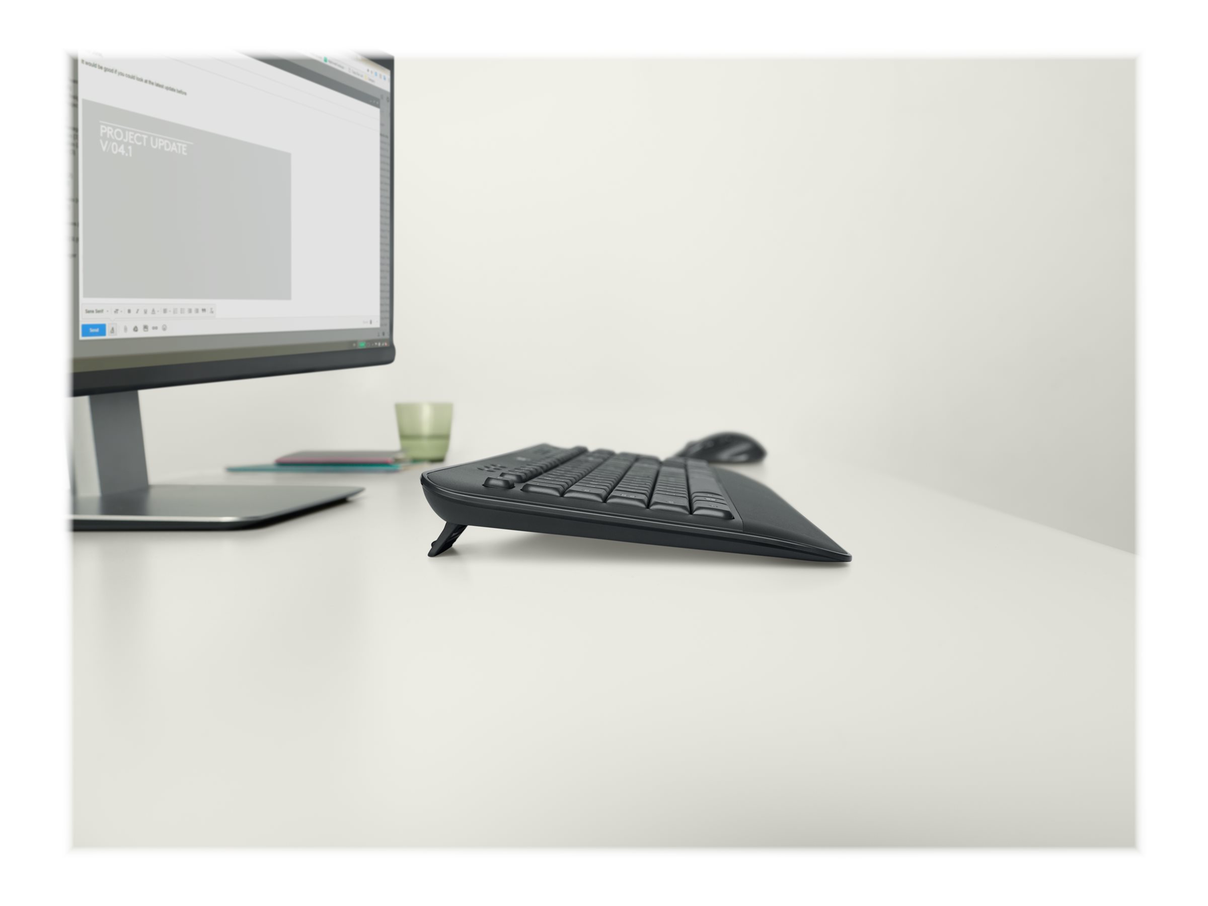 Tasterne er blevet optimeret for at forbedre nøjagtigheden og reducere støj - og dine fingre vil straks føle sig hjemme på den velkendte tasteoverflade og -layout. Den teksturerede håndledsstøtte og de justerbare vippeben holder dig komfortabel i lange perioder ved skrivebordet.
