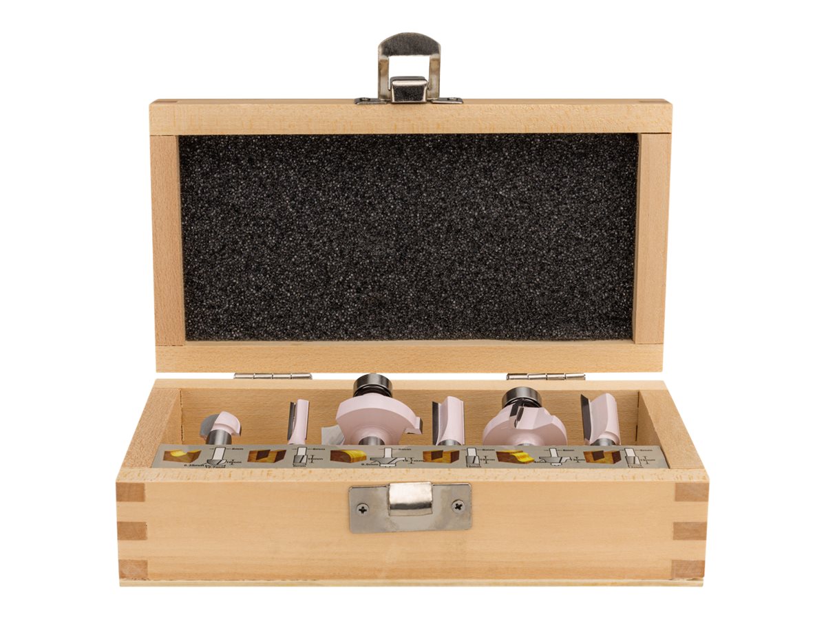 | Sætoplysninger | 1 x rilleskærer - d: 6 mm - driftslængde: 16 mm | 1 x rilleskærer - d: 10 mm - driftslængde: 19 mm | 1 x rilleskærer - d: 12 mm - driftslængde: 19 mm | 1 x hallow profil cutter - d: 12.7 mm - driftslængde: 10 mm | 1 x kantformende fræsebit med kugleleje - d: 12.7 mm - driftslængde: 16.7 mm | 1 x roman ogee-routerbit - d: 12.7 mm - driftslængde: 13 mm |