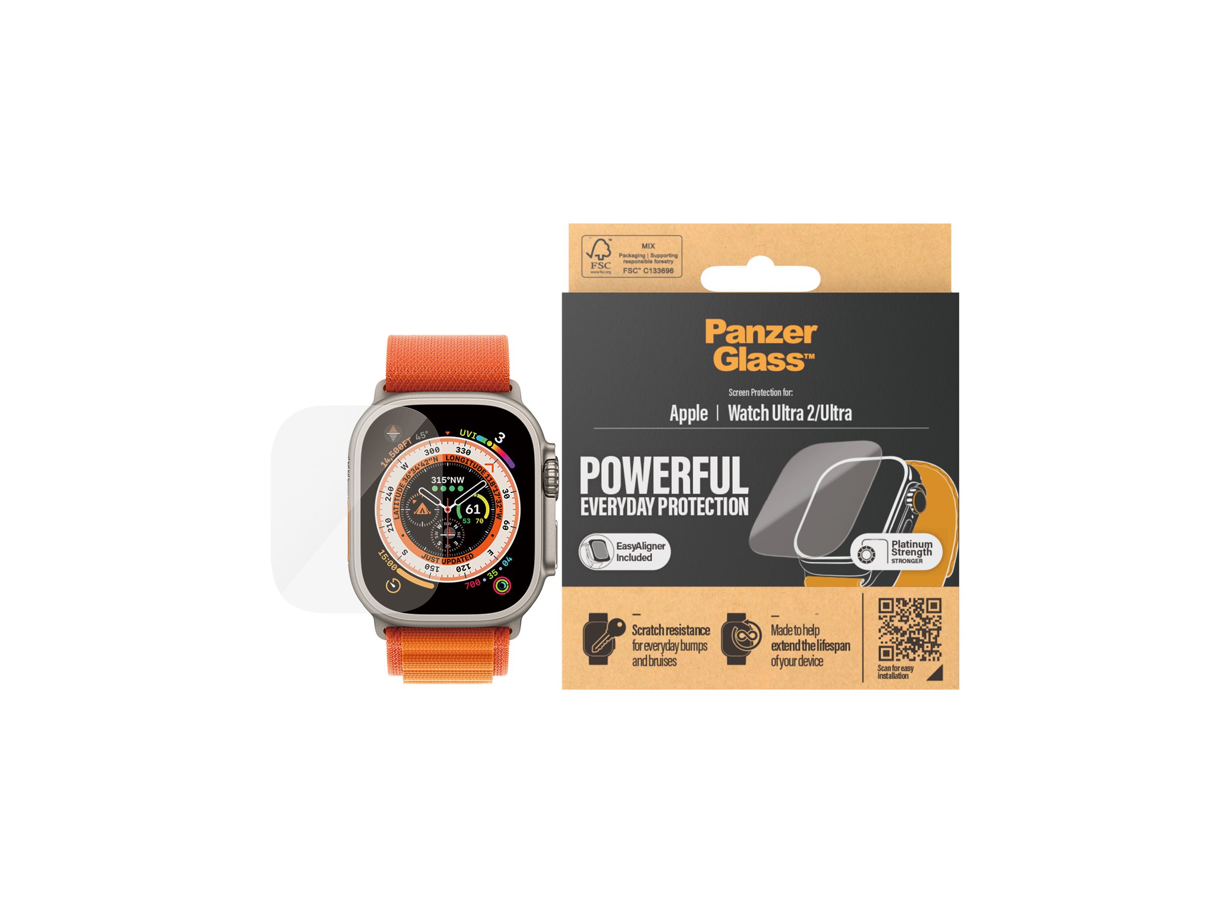 Stenhårde klipper på bjergtoppe? Knivskarpe koraller på bunden af havet? Eller forrevne drypsten i underjordiske huler? Med den her skærmbeskytter fra PanzerGlass kan du roligt tage dit Apple Watch med på selv de mest hardcore eventyr. Skærmbeskytteren er nemlig ekstremt modstandsdygtig over for ridser.Som prikken over i'et har skærmbeskytteren en smudsafvisende belægning, der reducerer fedtfingre. Selv installationen er legende let: Bare sæt skærmbeskytteren på dit ur – så er det slut med at frygte den skærmridsende lyd af glas mod sten. Det kommer muligvis aldrig til at ske, men hvis det gør, vil du fortryde, at du ikke klikkede "Tilføj til kurv".Skærmbeskytteren dækker hele din skærm. Og emballagen, ja, den er naturligvis FSC -mærket og kan genanvendes.