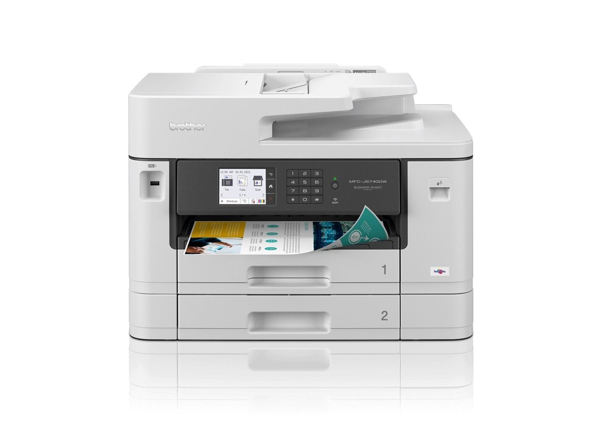 MFC-J5740DW er en alt-i-én A3-inkjetprinter, der er bygget til at holde, og som opfylder kravene for små kontorer og arbejdsgrupper. A3-funktionen gør det muligt at fremstille en lang række A3- og A4-farvedokumenter uden besvær, samtidig med at du får print i høj kvalitet, høje printhastigheder og lave driftsomkostninger. Du får både print, kopi, scan og fax. Print fra din arbejdsstation, et mødelokale eller fra din mobile enhed med trådløs forbindelse.