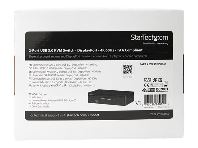 | Produktbeskrivelse | Startech 2 Port DisplayPort KVM Switch, 4K 60Hz, Single Display, Dual Port UHD DP 1.2 USB KVM Switch with Integrated USB 3.0 Hub and Audio, Dell, HP, Apple, Lenovo, TAA Compliant - Keyboard/Video/Mouse Switch (SV231DPU34K) - KVM / audio / USB switch - 2 porte - TAA-kompatibel |