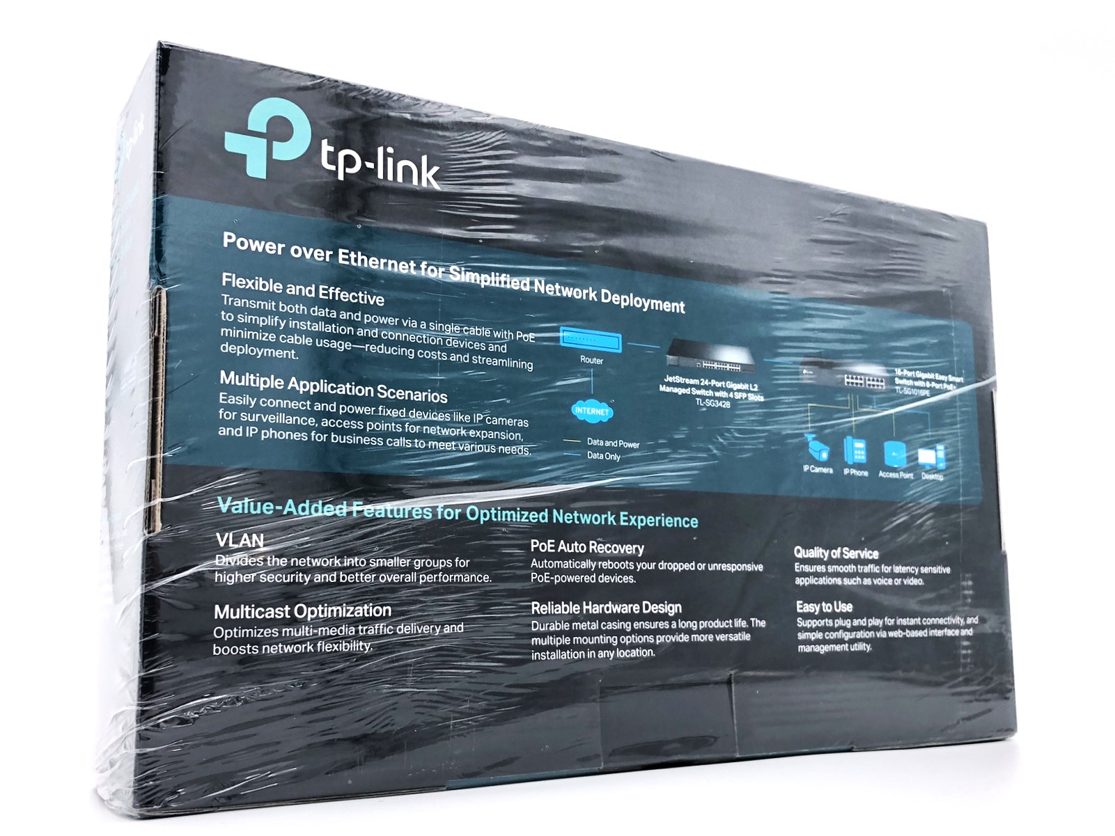 | Egenskaber | Datatransport, auto-negotiation, VLAN-understøttet, auto-uplink (auto MDI/MDI-X), IGMP snooping, portspejling, gem og send, QoS, Cable Diagnostics Function, løkkeforebyggelse, metalkabinet, DSCP support, Storm Control, PoE-administration, Link Aggregation |