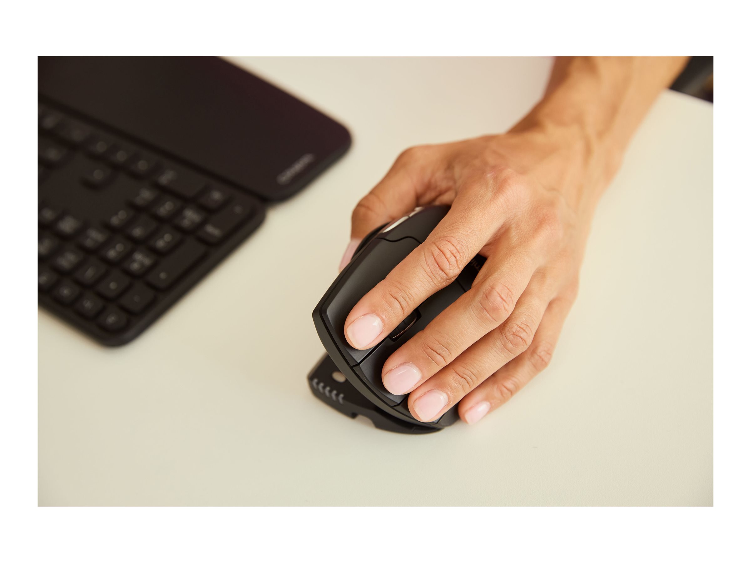 UniMouse bevæger sig med dig. Tilpas vinklen, tommelfingerstøtten og markørhastigheden for komfort, der passer dig perfekt. Den lodrette form understøtter en naturlig håndposition og mindsker spændinger, mens du arbejder. Mere kontrol, mindre belastning og ingen kompromis med ydeevnen, så du kan arbejde på din måde – uden smerter.