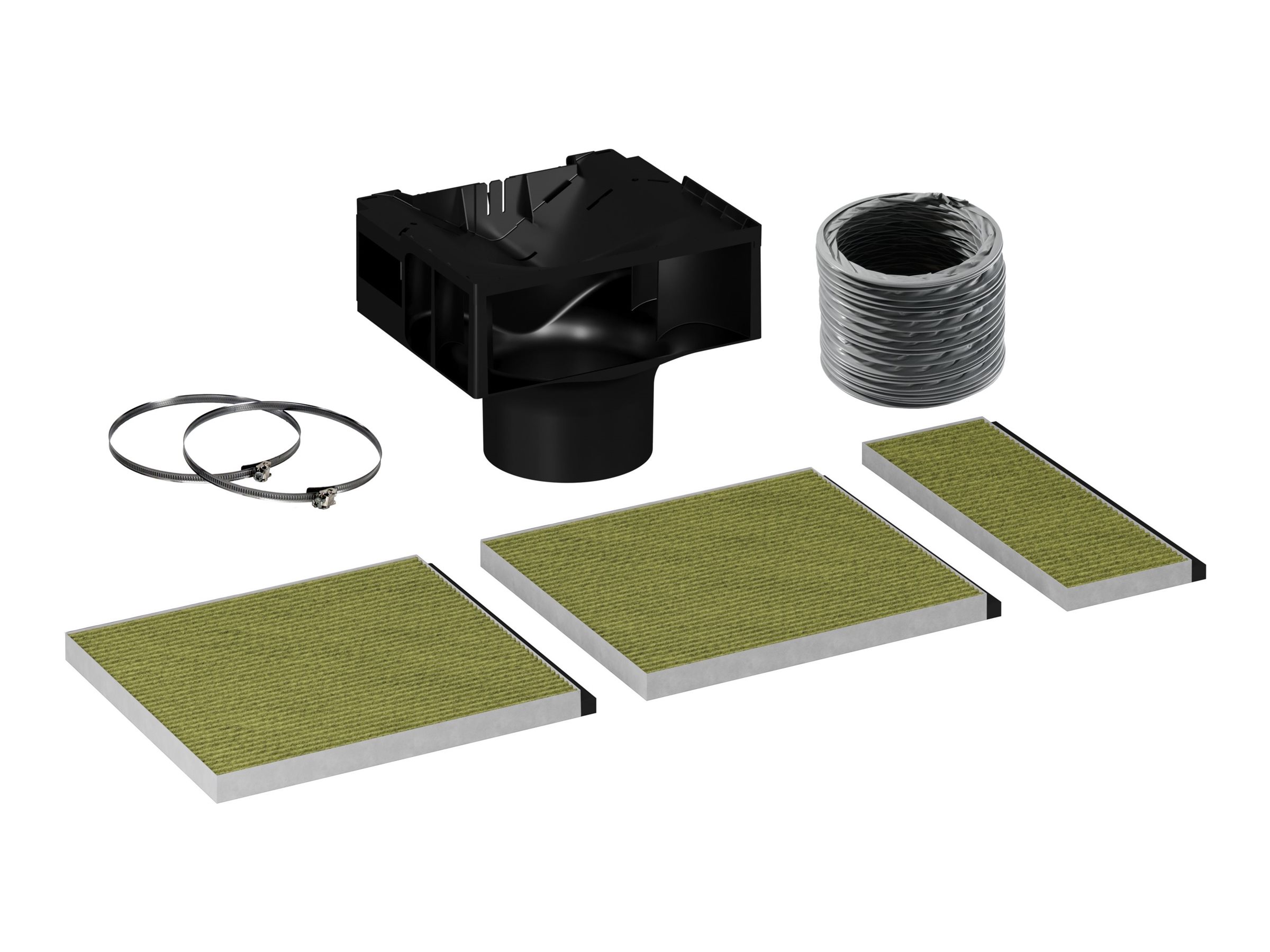 | Pakkeindhold | 3 x Clean Air Plus filter | Deflektor | Fleksibel slange | 2 x klemme | Monteringssæt |