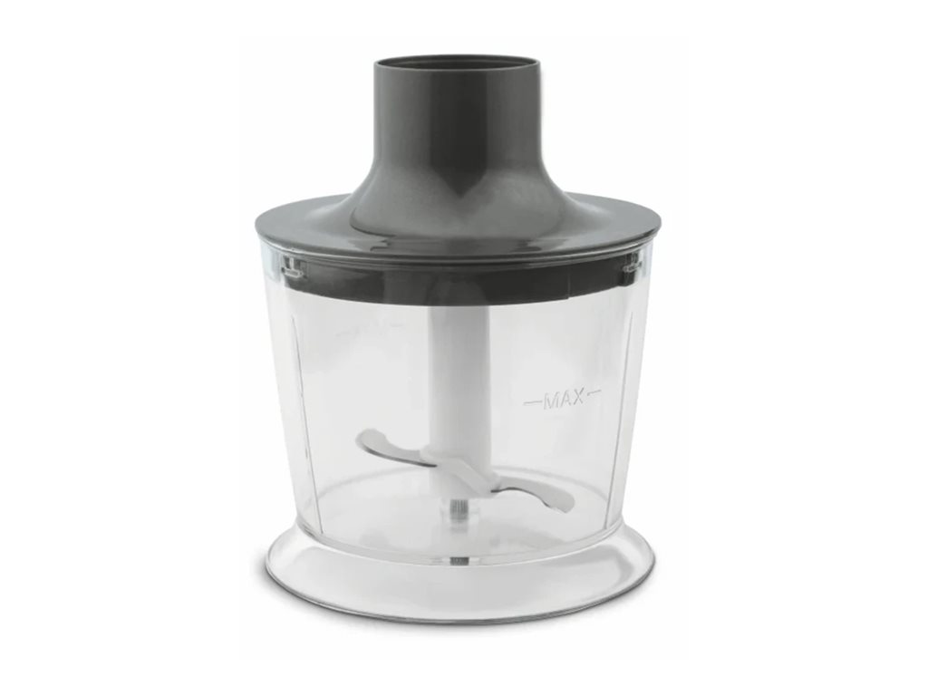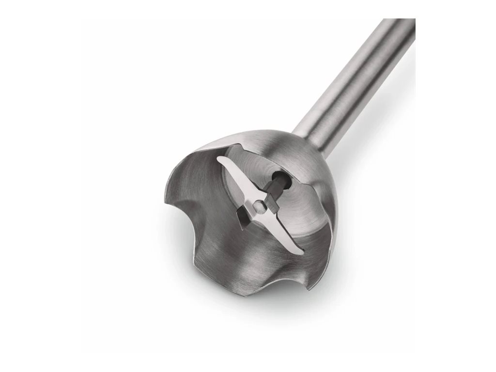 | Inkluderede klinger og påsættelser | Blade i rustfrit stål, lille håndblenderfod, hakkerpåsætning (500 ml), piskeris, hælende tilbehør |