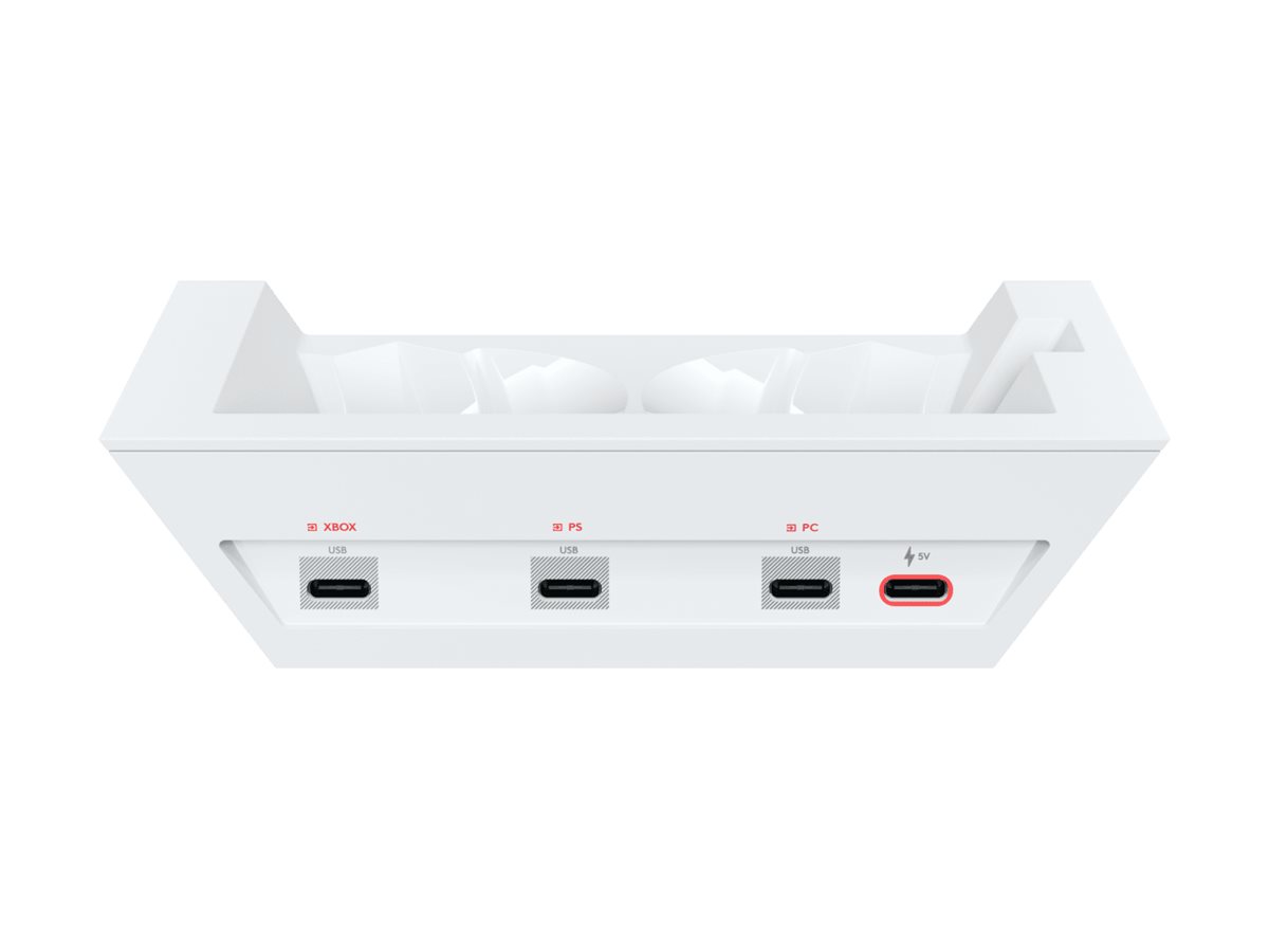 A50's kraftige basestation har magnetisk click-in-opladning, så dit headset altid er klar til at spille. De alsidige USB-C-porte på bagsiden giver dig mulighed for at tilslutte dine 3 foretrukne spilsystemer samtidigt. Og 7-core DSP-behandling gemmer dine brugerdefinerede lydindstillinger, når du skifter mellem konsoller og pc