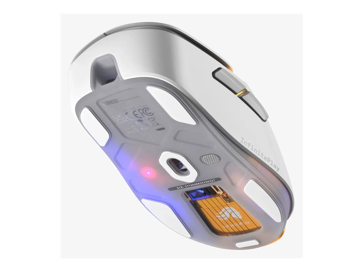 Egenskaber Ultralys, Glorious BAMF 3.0 sensor, RGB LED-bagbelysning, 130 millioner klik, 100 % PTFE-musefødder, 3 on board hukommelsesprofiler, scrollhjul, DPI-kontaktknap