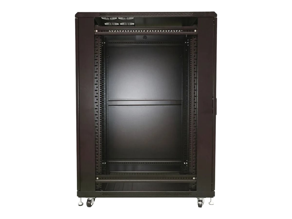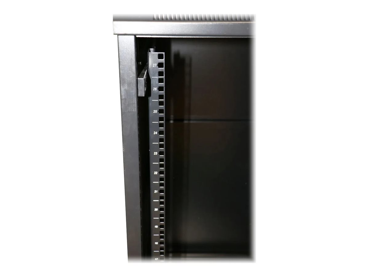 | Features | Lockable front door, top & bottom cable entry points, reversible front door, adjustable height feet, cable routing slots, 4 top fan cutouts, tempered glass front door, ventilation holes, removable side panels, ground wire, numbered rail markings, |