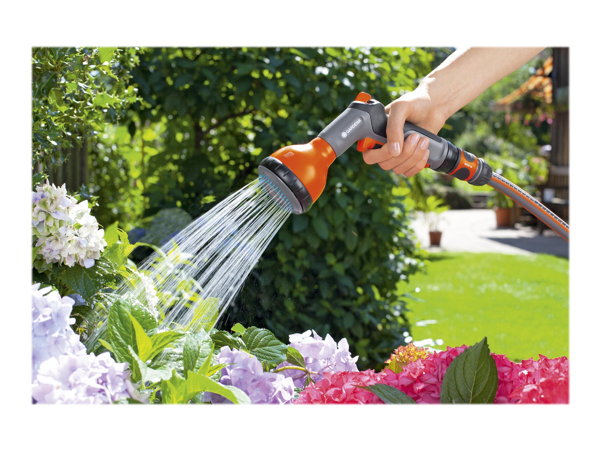 Hård 9-punkts stråle giver høj rensestyrke Blød bubble jet-stråle til vanding af potteplanter Blød brusestråle til vanding af de enkelte områder i haven.