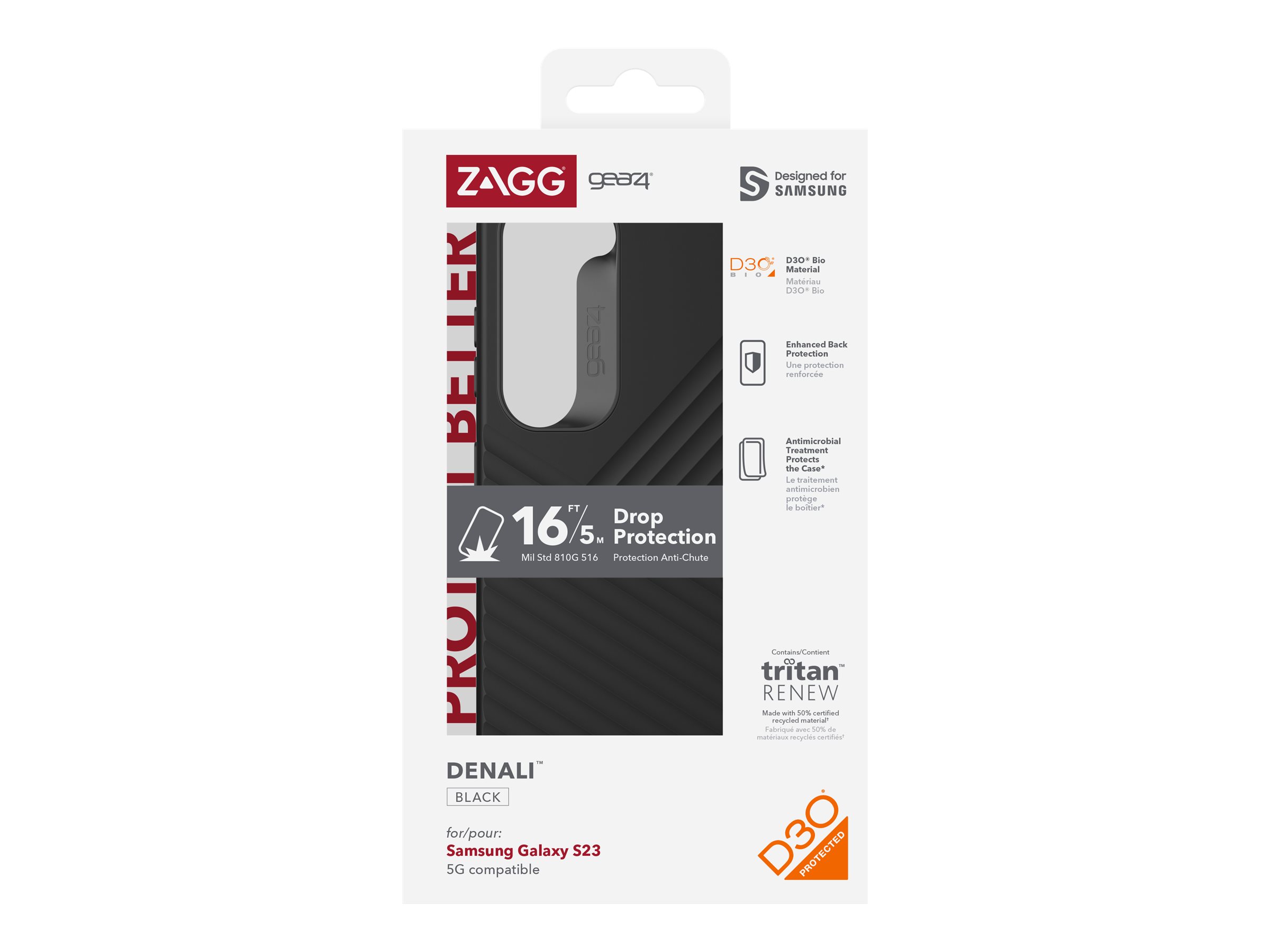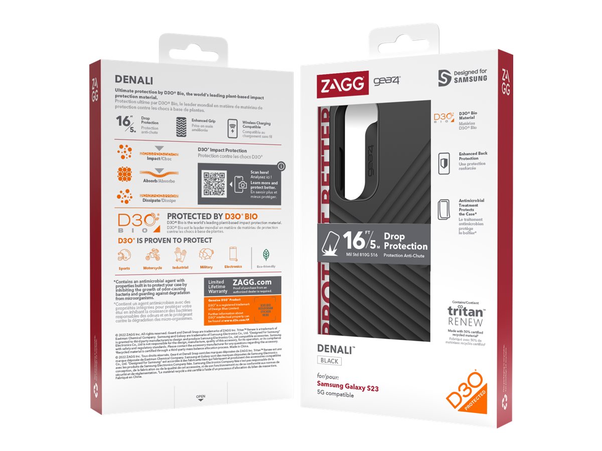 Denali-etuiet giver god faldbeskyttelse – 5 meter (16 fod) – med et skridsikkert greb og en tekstureret belægning. Hele bagsiden af etuiet er forstærket med D3O , så du ved, at du får overlegen beskyttelse. Men det er ikke det hele: Denali er også 5G-kompatibel og har en antimikrobiel behandling, der beskytter etuibelægningen. D3O – som er den samme teknologi, der anvendes af militæret og professionelle atleter – er nøglekomponenten i vores fantastiske telefonbeskyttelse. D3O er et bøjeligt, fleksibelt materiale, der hærder ved slag, afleder stød og beskytter din enhed. Polycarbonatbagpladen er delvist lavet af genbrugsplast, der består af genvundet affald eller industrielt overskudsmateriale. Indeholder RepelFlex , som er en antimikrobiel belægning med egenskaber, der er lavet til at beskytte din etuibelægning ved at hæmme væksten af lugtfremkaldende bakterier og beskytte mod nedbrydning fra mikroorganismer. *Denali er 5G-kompatibel, så du får et godt, stærkt signal. Alt bevæger sig hurtigt i dag, så du har brug for et 5G-kompatibelt etui, der tillader dig at holde trit. Denali er kompatibel med de fleste trådløse opladere.