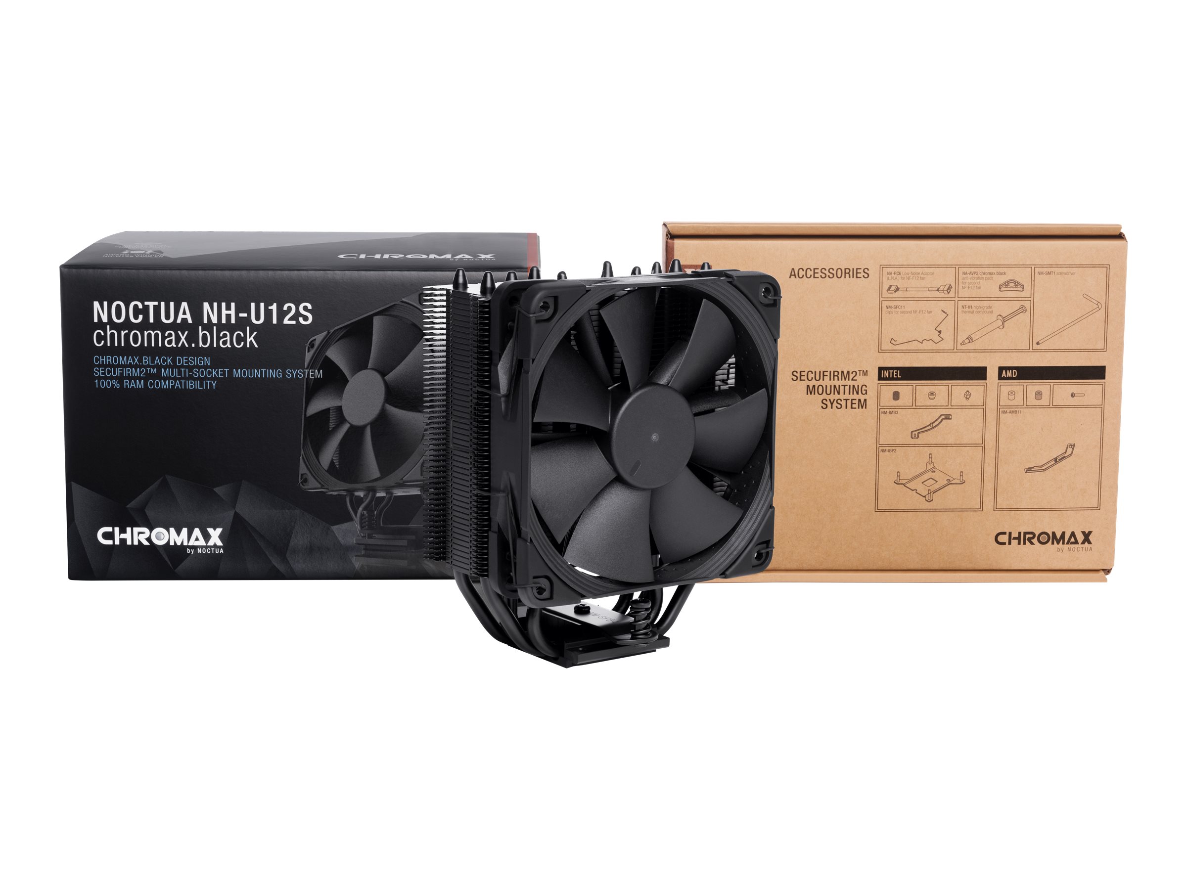 | Package Content | Low-Noise Adaptor (L.N.A.), SecuFirm2 Mounting Kit, NT-H1 high-grade thermal compound, Noctua metal case-badge, NF-F12 PWM chromax.black premium fan |
