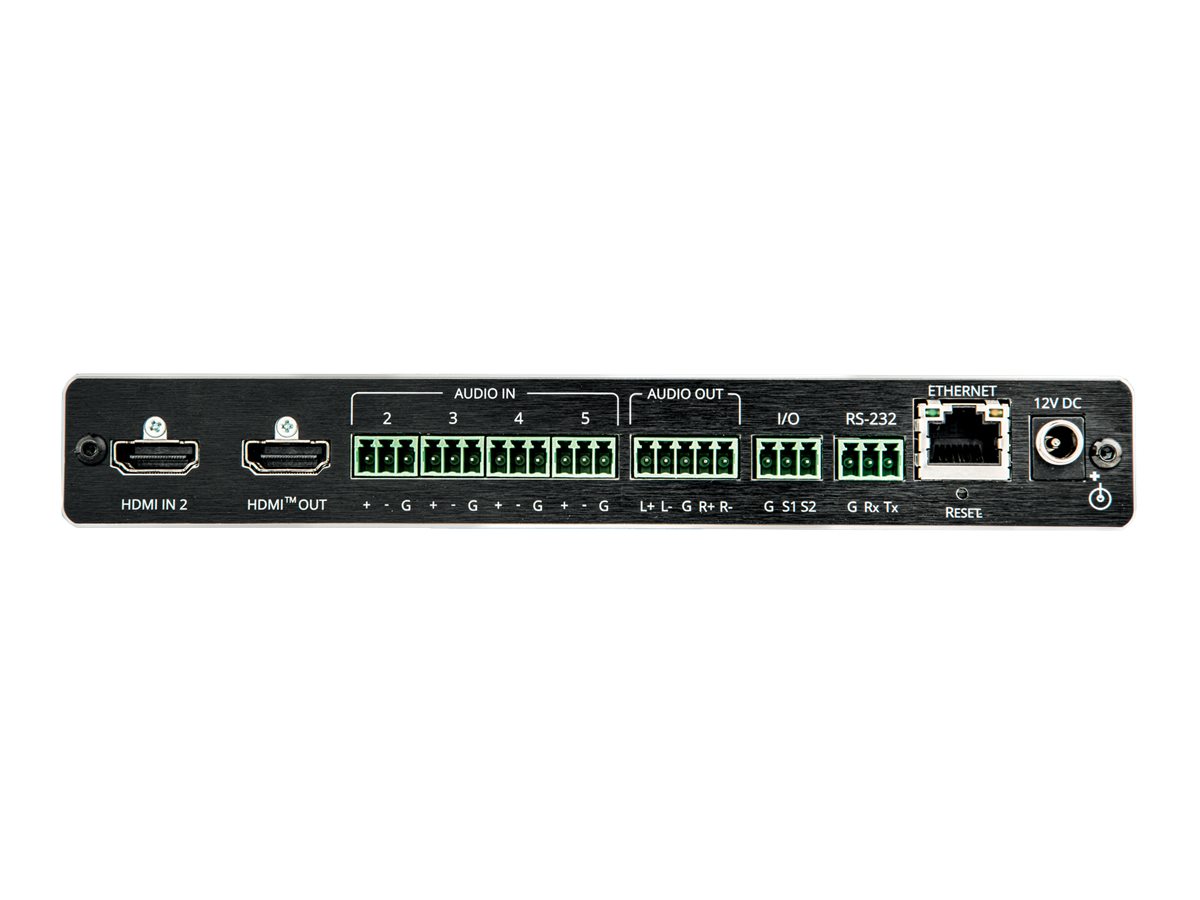 | Terminals | (2) x HDMI input - 19 pin HDMI Type A | (1) x unbalanced audio input - mini-phone stereo 3.5 mm | (4) x balanced audio input - 3-pin terminal block | (1) x HDMI output - 19 pin HDMI Type A | (1) x balanced audio output - 5-pin terminal block - stereo |