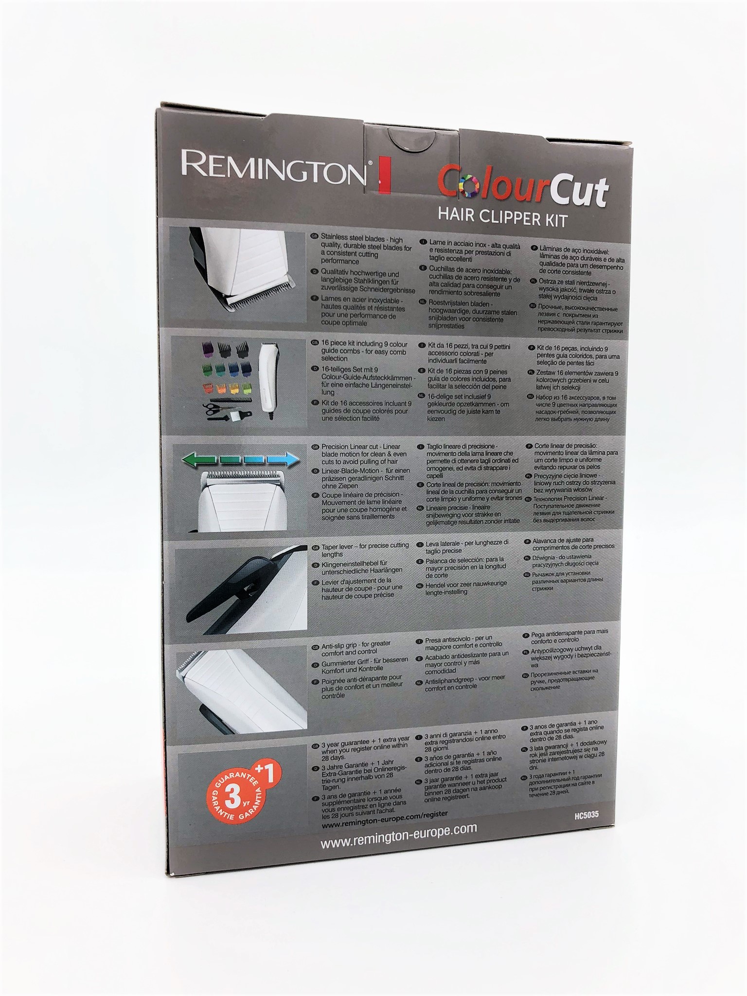 Hårklipning er lige blevet meget nemmere og meget sjovere med Remington ColorCut. Ud over en hårklipper af høj kvalitet indeholder sættet ni farvekamme fra 0,5 til 2 mm. Så uanset hvilken længde du vil have, eller hvilket look du vil opnå, skal du bare vælge den rigtige farve til dig, og så er du i gang. Remington ColorCut er det ideelle sæt til hårklipning derhjemme med minimalt besvær, bare enkel styling. Det er perfekt til familier og indeholder 16 tilbehør, der giver dig alle de værktøjer, du har brug for til at style dit eget hår. En rensebørste sikrer, at uønsket hår fjernes inden næste brug, og en saks og en kam gør det muligt at trimme længere hårlængder inden klipning og sortering. Og når du er færdig, giver en nakkebørste dig den sidste rengøring og det sidste touch, inden du forlader frisørstolen.