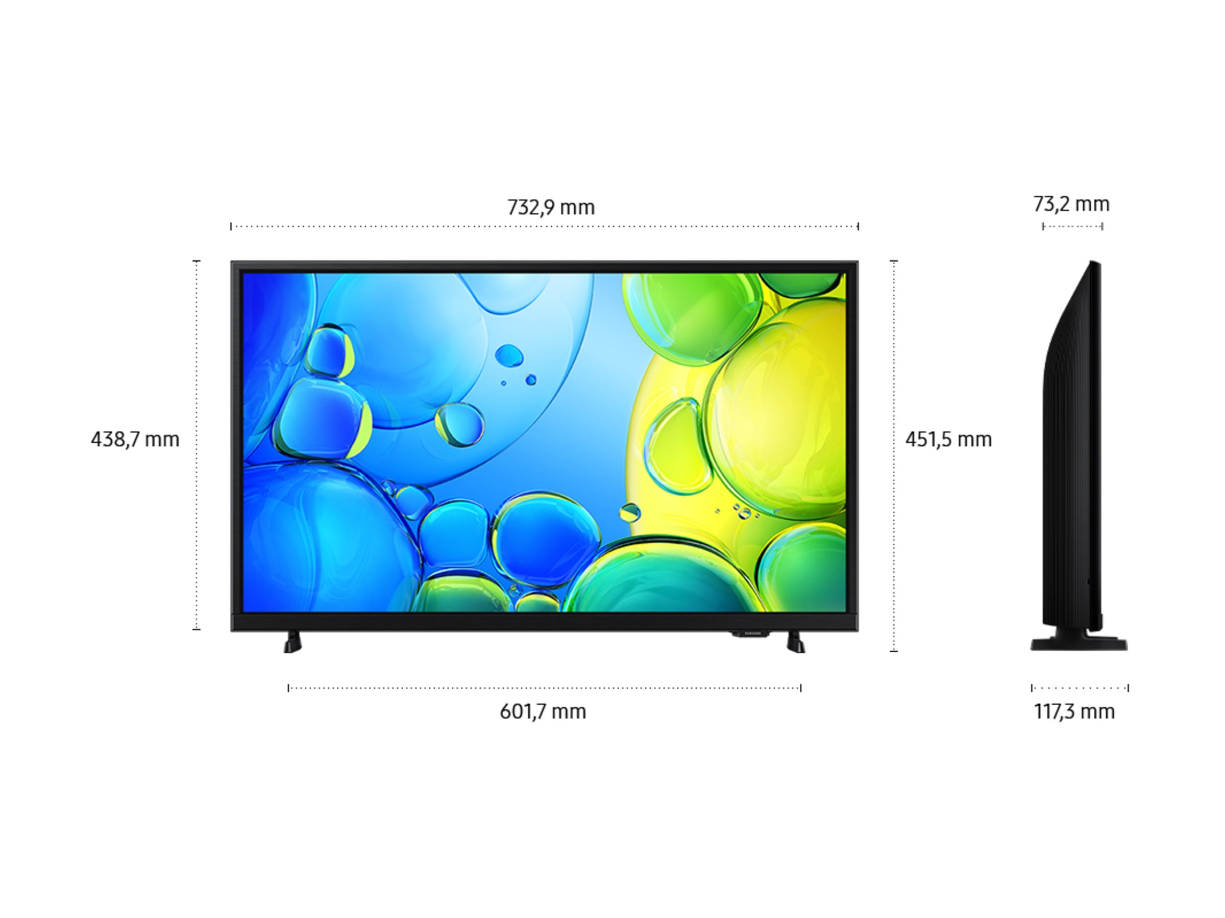 | Dimensioner (B x D x H) - uden stander | 73.29 cm x 7.32 cm x 43.87 cm |