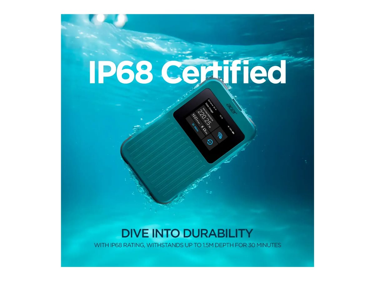Acer Connect M4 er designet til mobil forbindelse og har et lithium-ion-batteri med en kapacitet på 8000 mAh, så du kan holde strømmen kørende, når du er på farten. Den er udstyret med en 2,4" touchskærm og 8 GB flashlager, hvilket giver en intuitiv brugeroplevelse og samtidig letter adgangen til dine data. Enheden overholder IP68- og MIL-STD-810H-standarderne, hvilket sikrer holdbarhed i forskellige miljøer og gør den til en ideel ledsager til både arbejde og fritid. Dette mobile hotspot understøtter flere mobilprotokoller, herunder 5G NR, LTE og 4G LTE, hvilket muliggør forbindelse på tværs af netværk. Med mulighed for at forbinde op til 16 WiFi-enheder samtidigt forbedrer Connect M4 din netværksoplevelse. Derudover understøtter den dobbelt SIM-funktioner, herunder eSIM, hvilket giver fleksibilitet i forbindelsesmulighederne. Den medfølgende globale 1 GB dataplan sikrer, at du forbliver forbundet, uanset hvor du rejser.