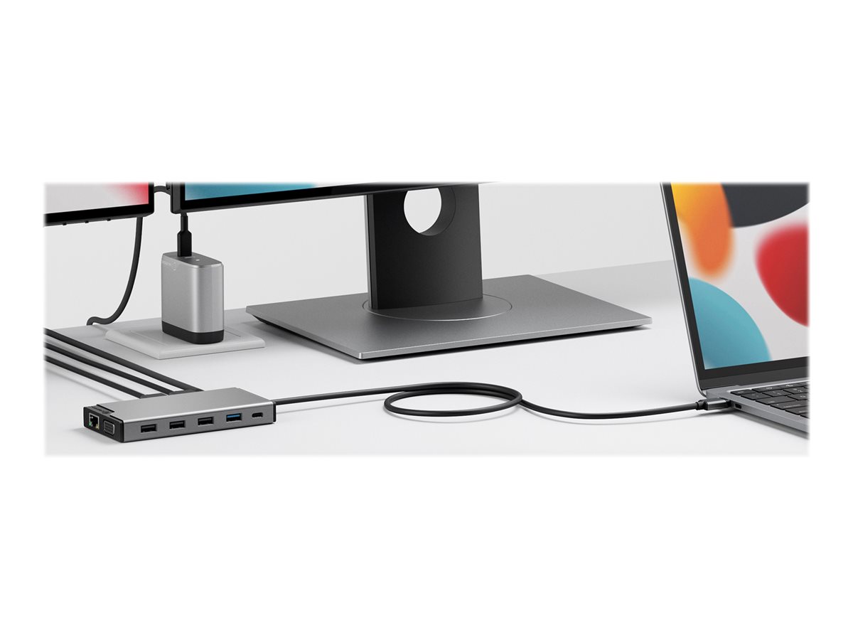 Denne mini-dock har en række grænseflader, herunder HDMI, VGA, USB-A og Ethernet, hvilket gør den kompatibel med forskellige enheder og perifere enheder.