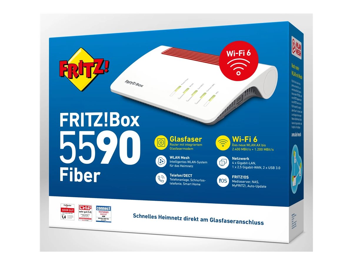 | Produktbeskrivelse | AVM FRITZ!Box 5590 Fiber - trådløs router - GPON-terminal/stemmekort - Wi-Fi 6 - desktop |