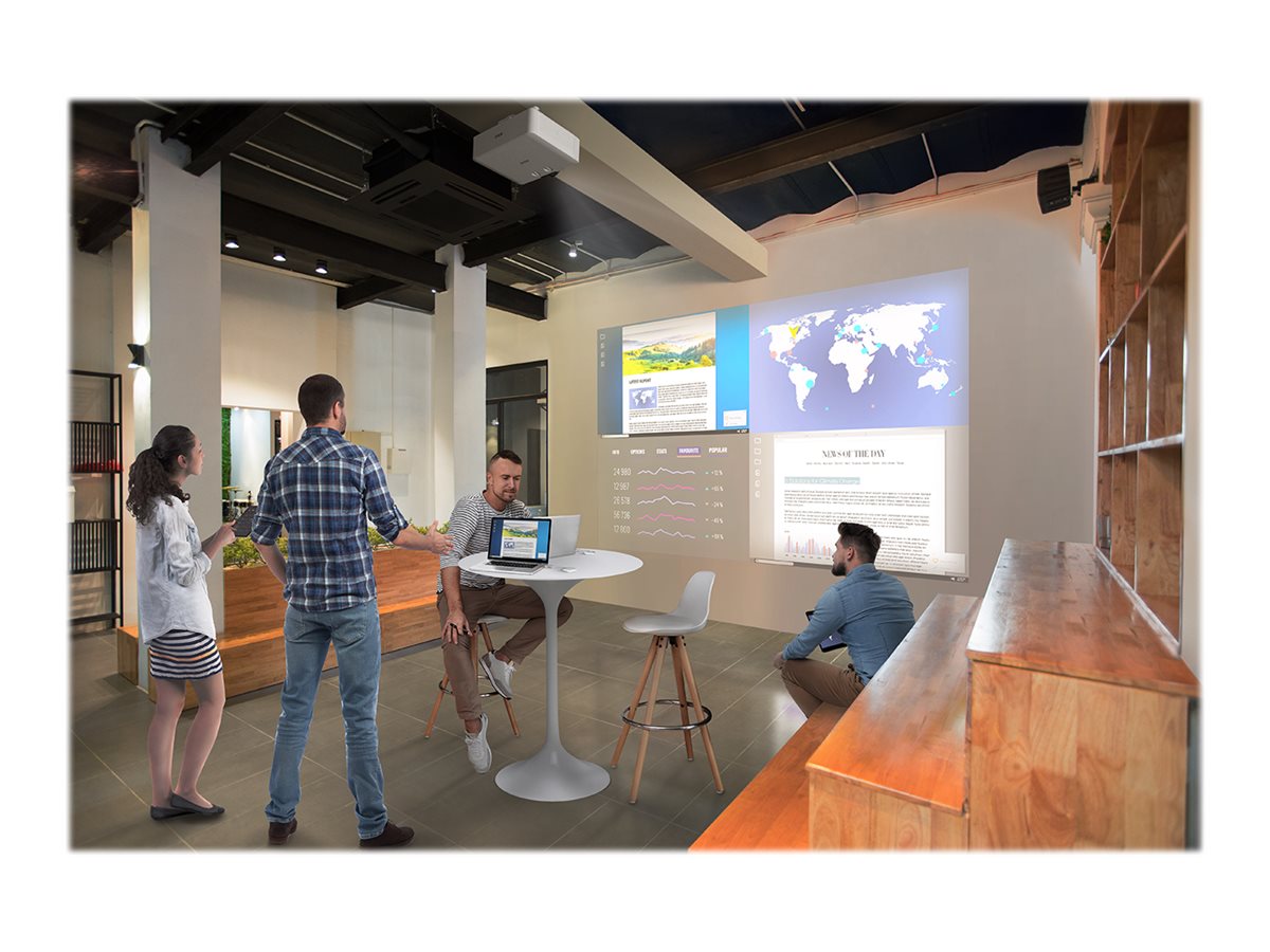 EB-L530U indeholder mange professionelle funktioner, som gør installationen enkel, selv når der produceres mere avancerede skærme. Denne stilfulde og kompakte projektor tilbyder 360-graders installation uden at gå på kompromis med skærmkvaliteten og understøtter 16:6 ultrabred skærm, hvilket betyder, at du kan maksimere den tilgængelige synlige skærmplads. Med muligheden for delt skærm kan du også vise to eller fire billeder fra forskellige kilder samtidig, og geometrisk korrektion og edge blending hjælper med at skabe et stort, problemfrit billede ved hjælp af flere skærme.