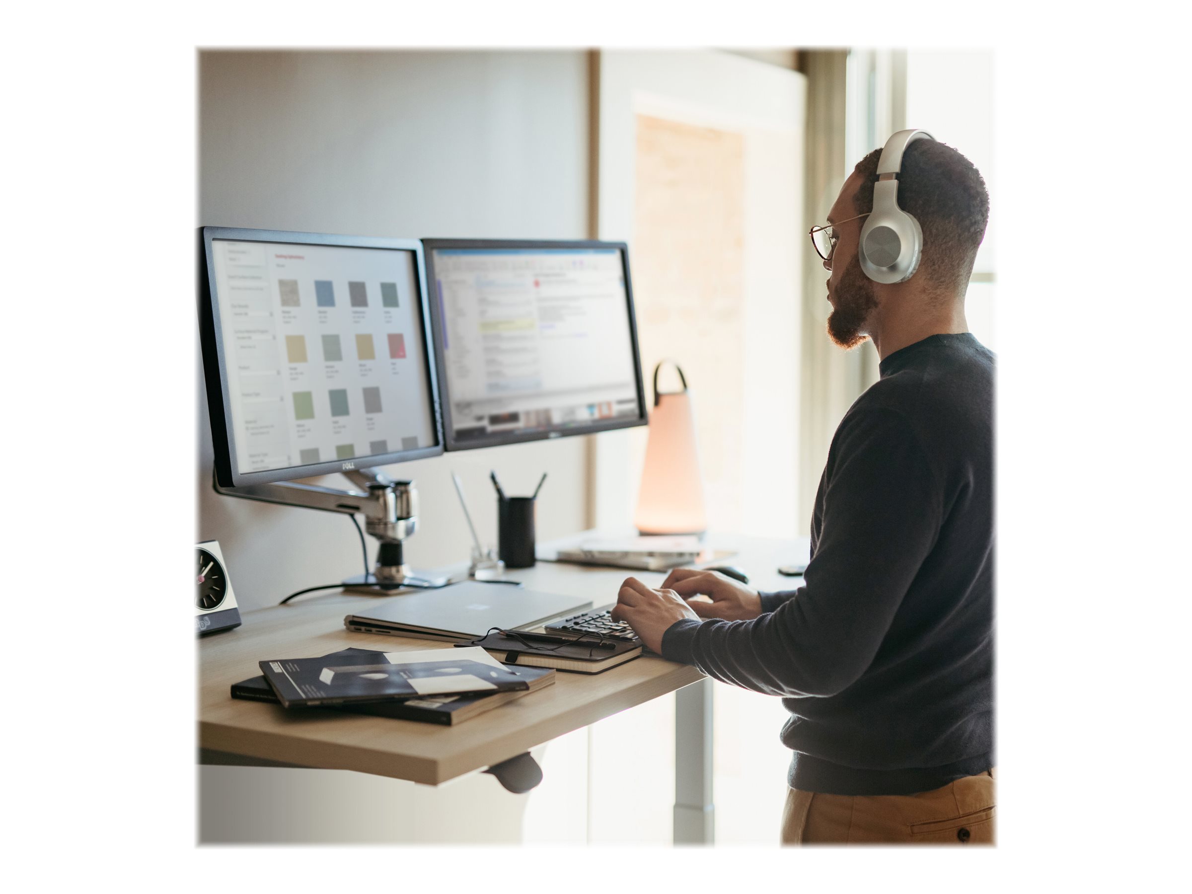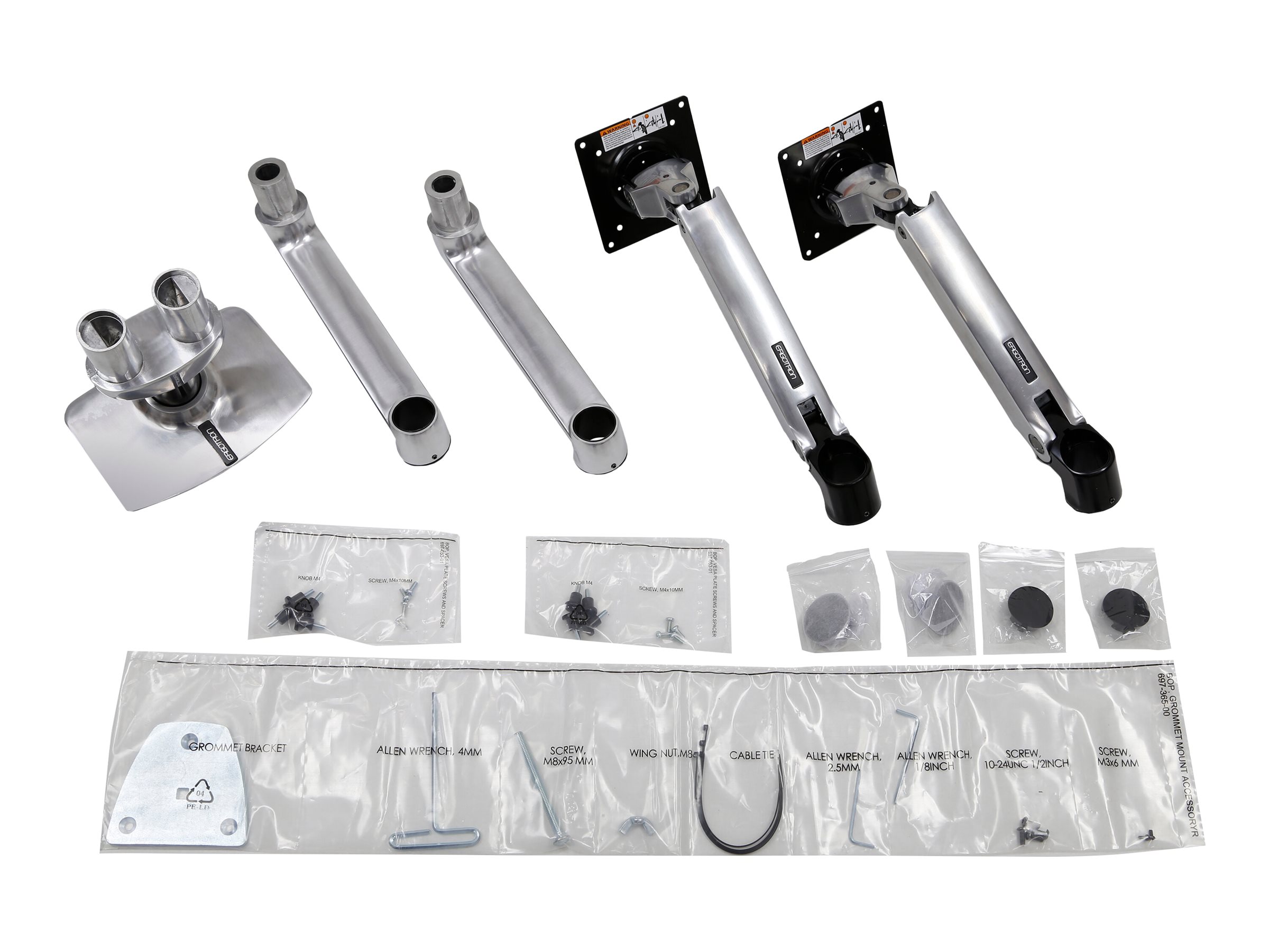 | Monteringskomponenter | Klemme til montering på skrivebord, pakning til gennemføring, stang, 2 artikulerende arme, 2 forlængelses beslag, t-bøjle, base |