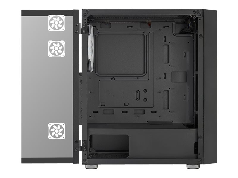 | Egenskaber, systemkabinet | Meshed front panel, kabeladministrations-system, understøtter 120 mm radiator bagtil, understøtter 120/240/280/360 mm radiator i frontpanel, understøtter 120/240 mm radiator i toppanel |